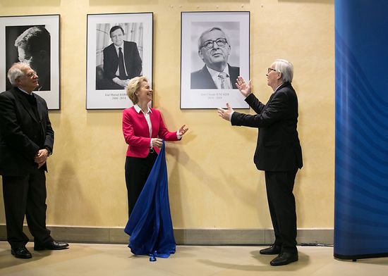 Kurz vor 11 Uhr ist dann so weit. Ursula von der Leyen, seine Nachfolgerin wartet schon, genau wie die neuen und alten Kommissare und Spitzenbeamte der EU-Kommission, die sich heute versammelt haben, um sich feierlich vom scheidenden Kommissionschef zu verabschieden. Alles steht bereit für das offizielle Adieu. Auch Junckers Porträt, das künftig den Eingang der EU-Kommission schmücken wird. Neben Jacques Delors, Jose Manuel Barroso und Jacques Santer hängt nun auch Junckers Bild neben den historischen Kommissionschefs. Und Juncker darf es selbst enthüllen.