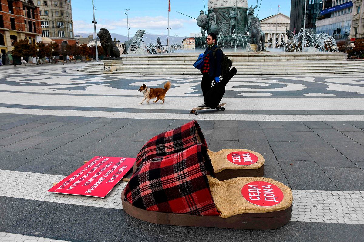 „Sedi doma“ – „Bleib zu Hause“ – steht auf dem Paar Hausschuhe mit rotem Karomuster, das mitten auf dem zentralen Platz Mazedoniens in der Hauptstadt Nordmazedoniens thront. Niemand hat die bequemen Schlappen dort vergessen, deren Anblick allein schon genügt, um einen das Gefühl des gemütlichen Herumlungerns auf der heimischen Couch verspüren zu lassen.