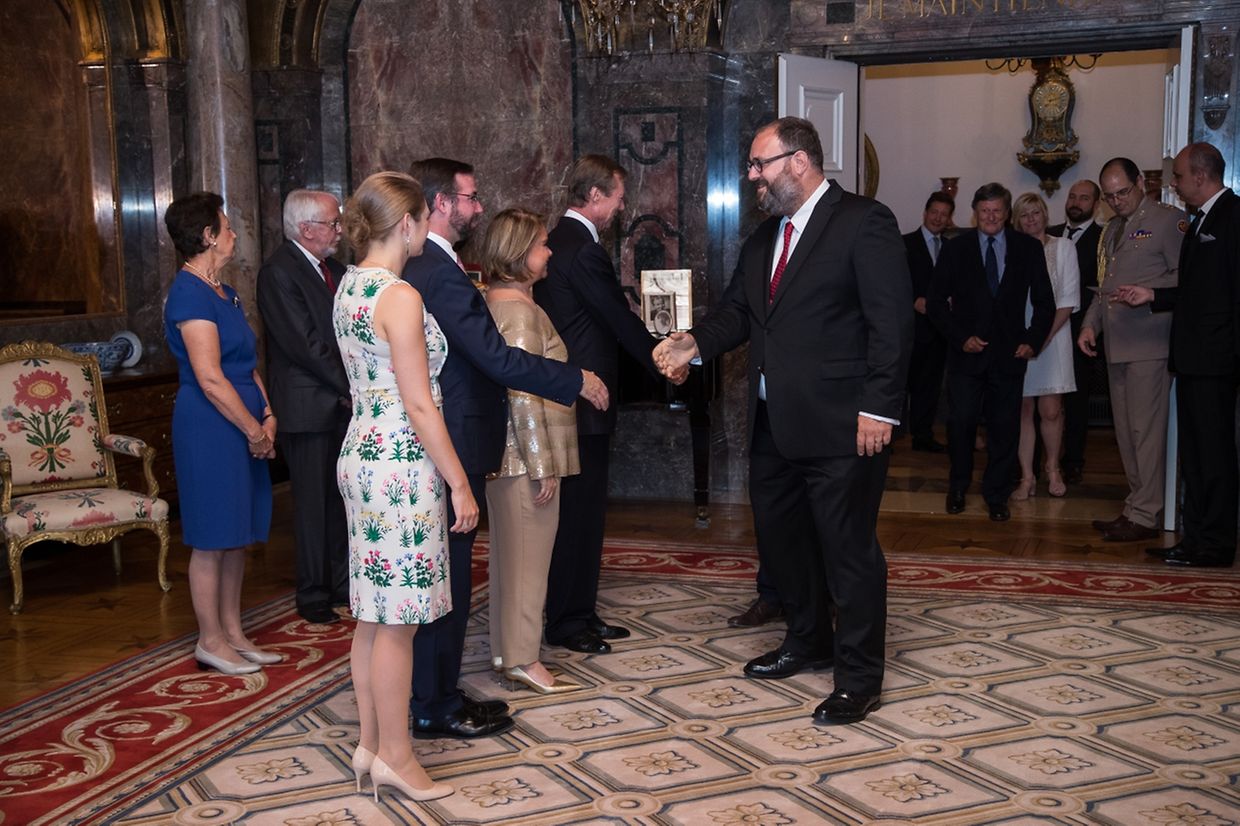 Neben Großherzog Henri und seiner Gemahlin nahmen auch Erbgroßherzog Guillaume und Erbgroßherzogin Stéphanie sich die Zeit, die Gäste persönlich zu begrüßen.