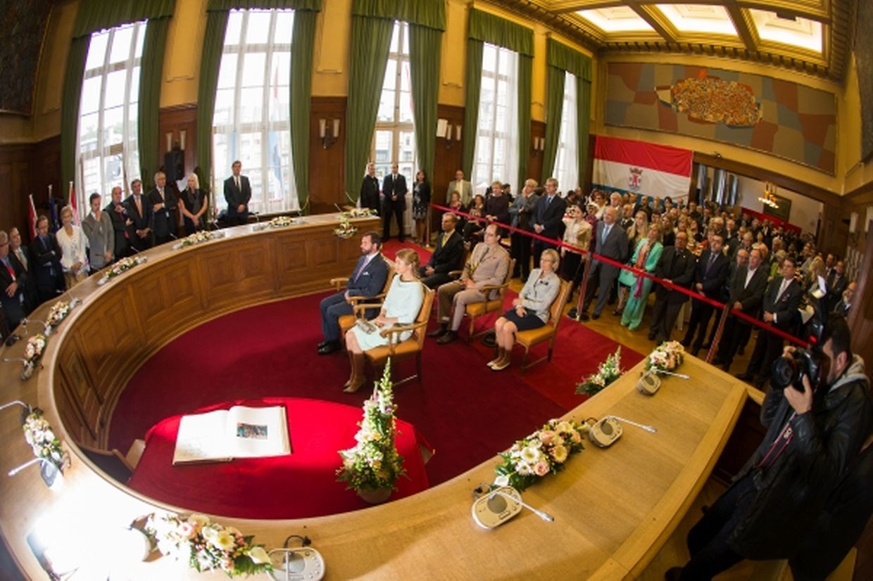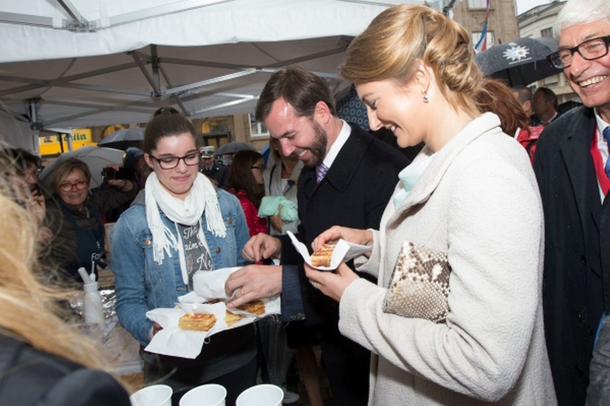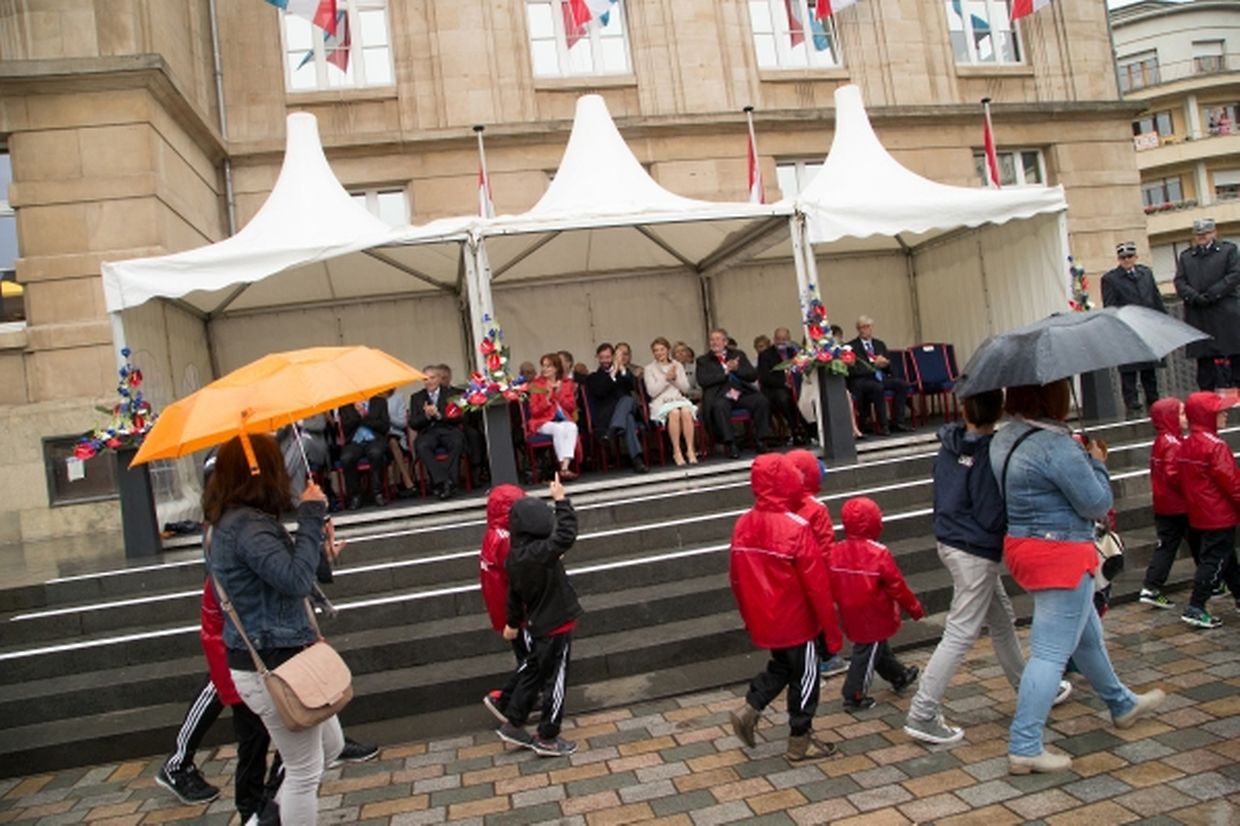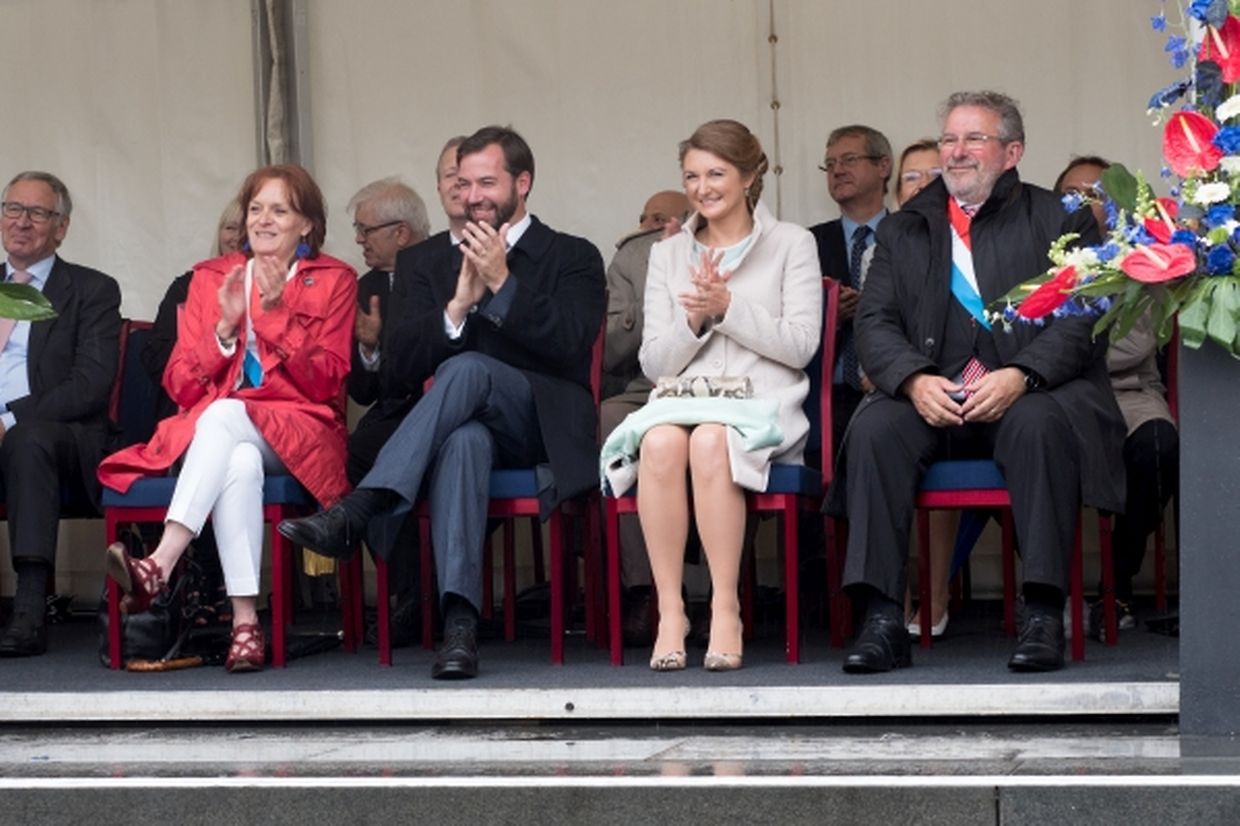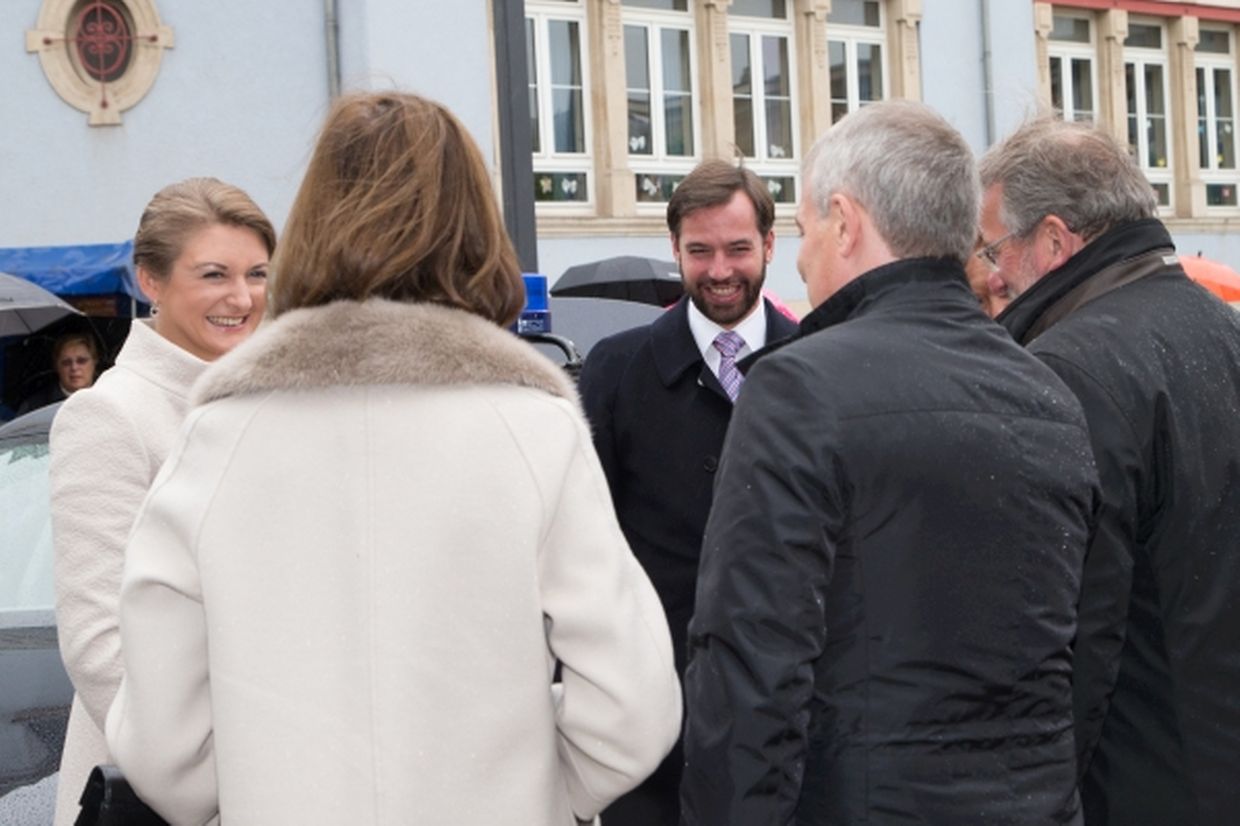 Nach ihrer Ankunft am Brillplatz legten sie beim Resistenzmuseum Blumen nieder. Wie gewohnt nahm sich das Paar viel Zeit, um Hände zu schütteln und ein Wort mit einigen der vielen Zuschauer auszutauschen. So dass der Gang bis zum Rathausplatz weitaus länger dauerte als die zwölf Minuten, die auf dem Fußgängerleitsystem angegeben sind. Vor dem Rathaus, schaute sich das sichtlich gut gelaunte Paar das Defilee der Escher Vereine an. War es bisher Tradition, dass die Stadt dem Paar ein Geschenk machte, so wurde letztes Jahr entschieden, stattdessen eine Spende an eine karitative Vereinigung aus Esch/Alzette zu überreichen. Nachdem Erbgroßherzog Guillaume und Prinzessin Stéphanie sich im goldenen Buch der Gemeinde eingetragen hatten, traten sie auf den Balkon des Rathauses, von wo aus sie den zahlreichen Menschen zuwinkten.