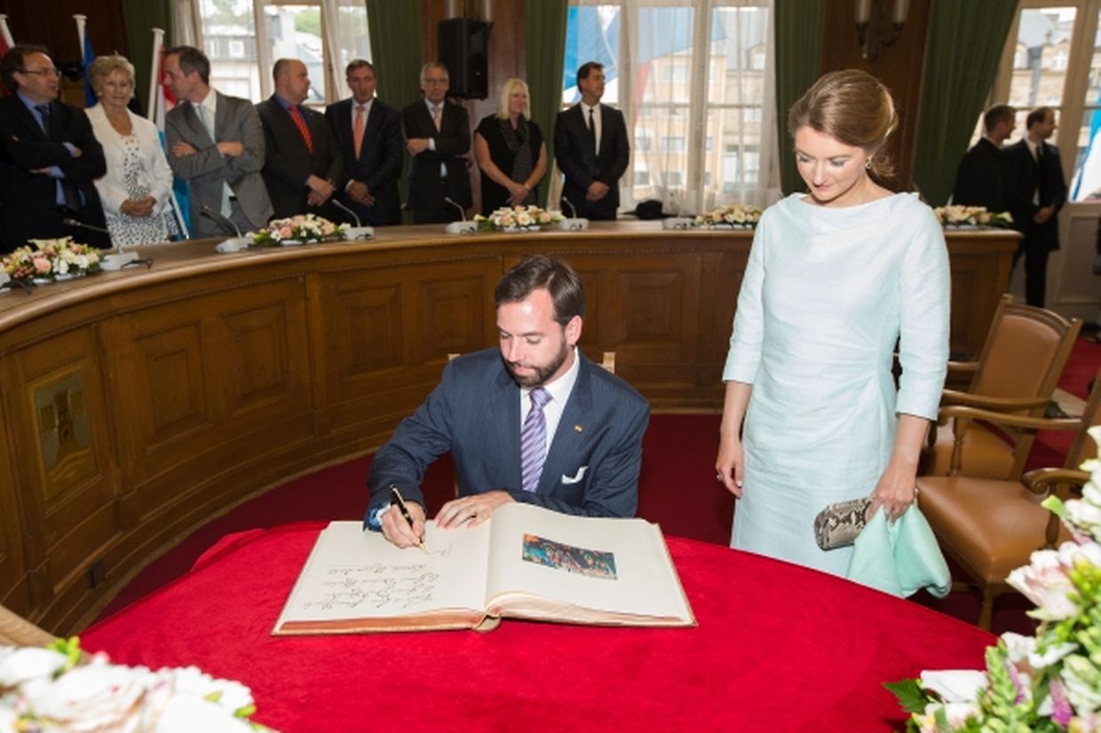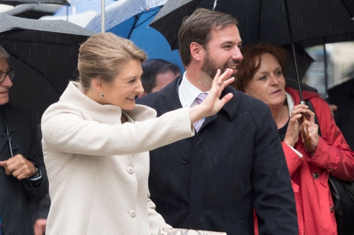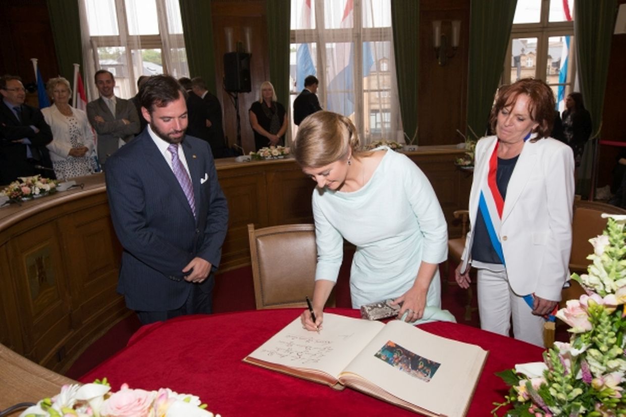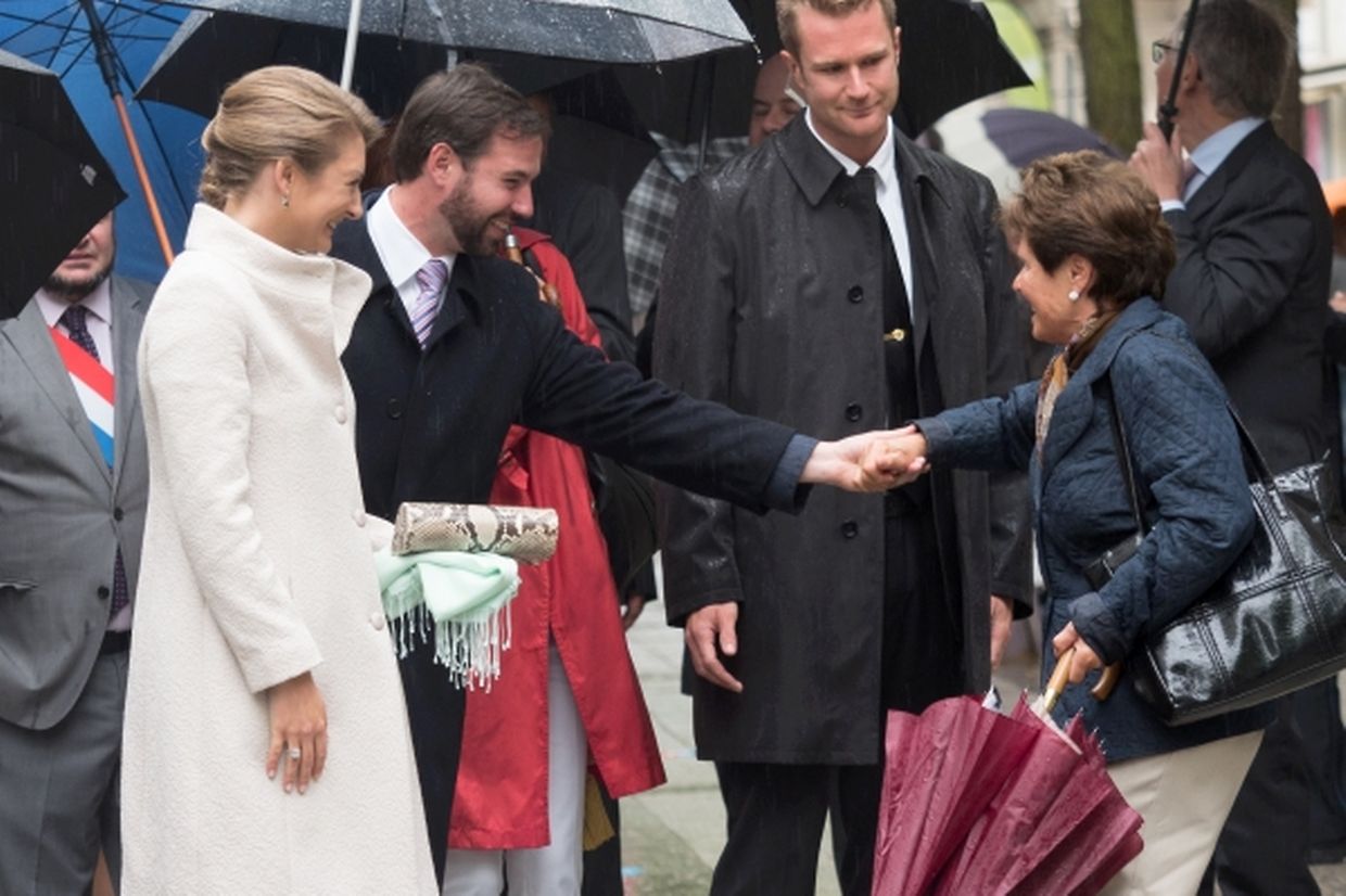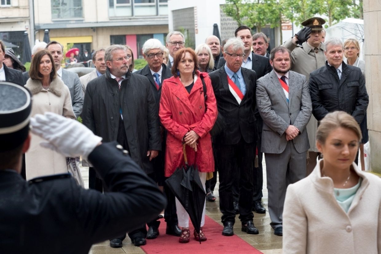 Nach ihrer Ankunft am Brillplatz legten sie beim Resistenzmuseum Blumen nieder. Wie gewohnt nahm sich das Paar viel Zeit, um Hände zu schütteln und ein Wort mit einigen der vielen Zuschauer auszutauschen. So dass der Gang bis zum Rathausplatz weitaus länger dauerte als die zwölf Minuten, die auf dem Fußgängerleitsystem angegeben sind. Vor dem Rathaus, schaute sich das sichtlich gut gelaunte Paar das Defilee der Escher Vereine an. War es bisher Tradition, dass die Stadt dem Paar ein Geschenk machte, so wurde letztes Jahr entschieden, stattdessen eine Spende an eine karitative Vereinigung aus Esch/Alzette zu überreichen. Nachdem Erbgroßherzog Guillaume und Prinzessin Stéphanie sich im goldenen Buch der Gemeinde eingetragen hatten, traten sie auf den Balkon des Rathauses, von wo aus sie den zahlreichen Menschen zuwinkten.