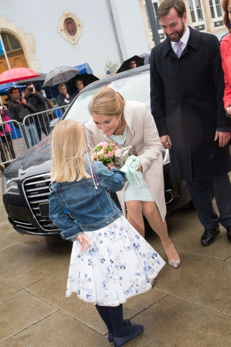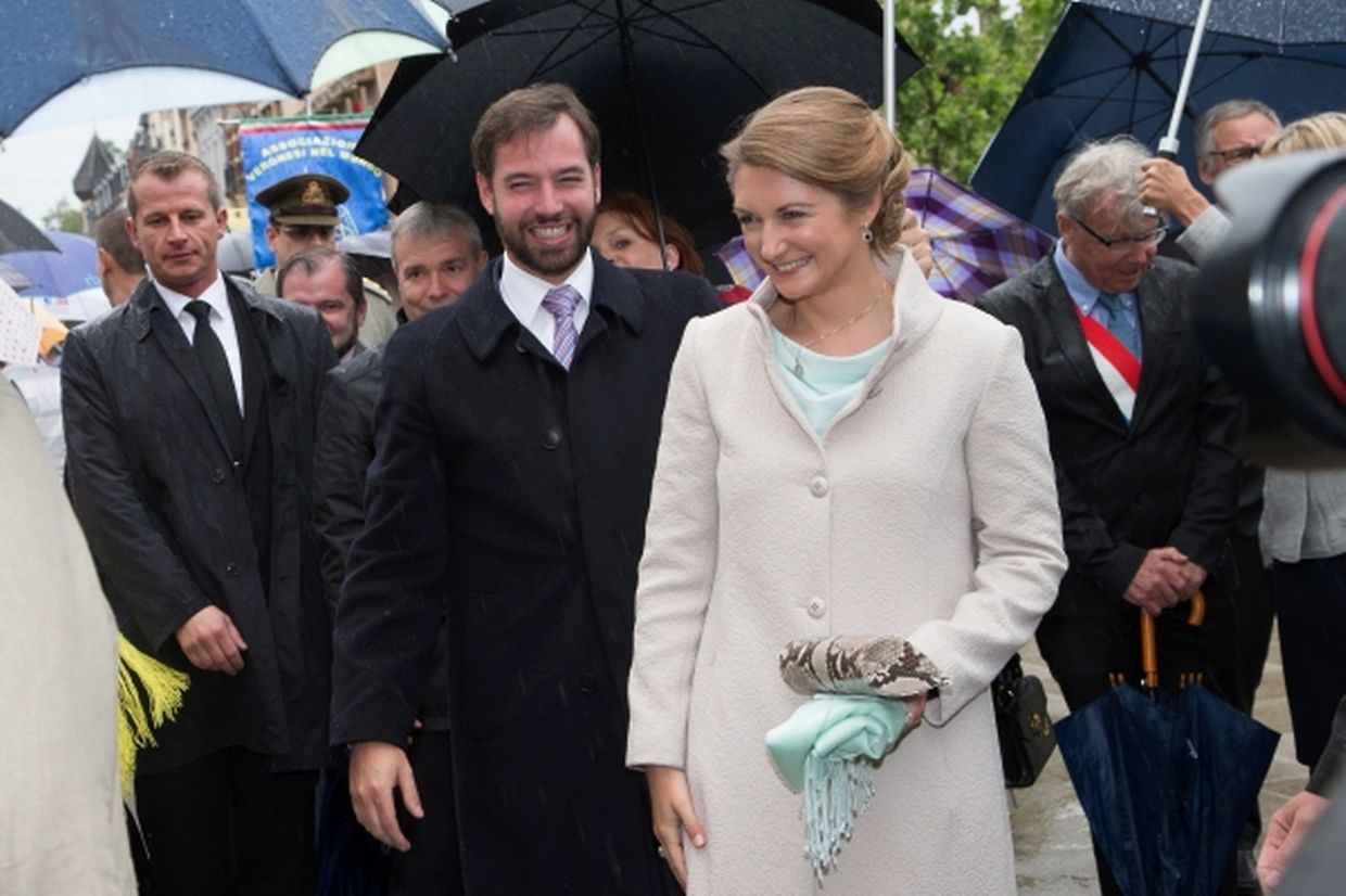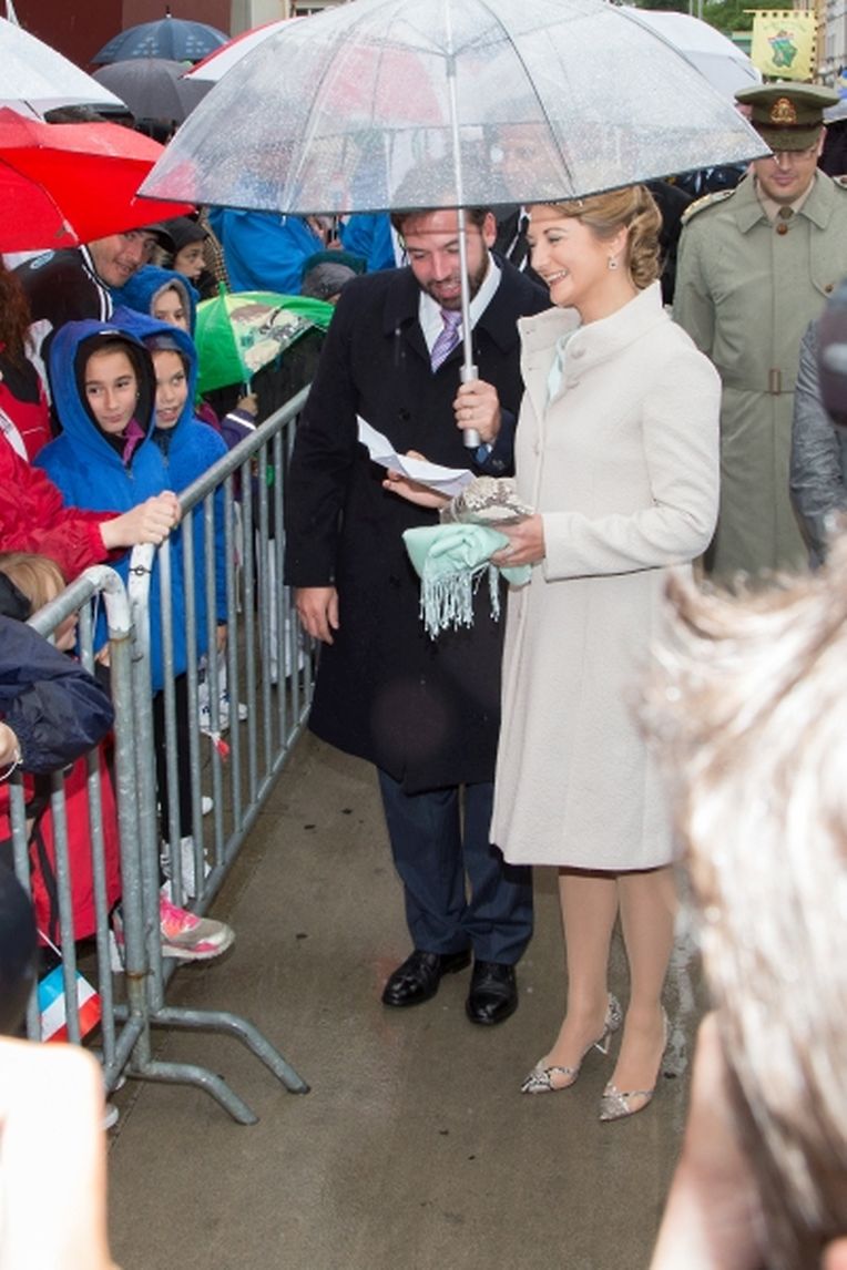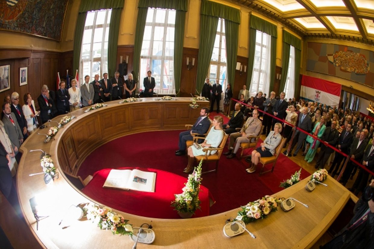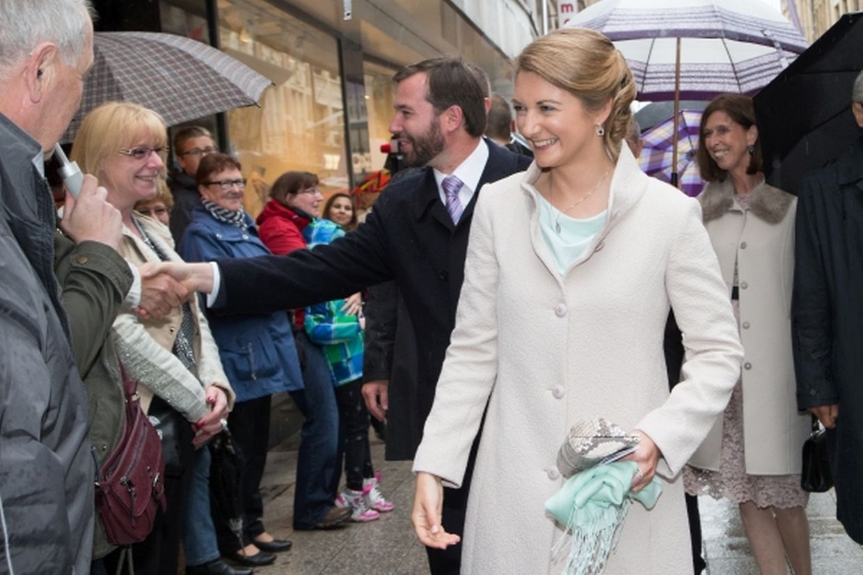 Nach ihrer Ankunft am Brillplatz legten sie beim Resistenzmuseum Blumen nieder. Wie gewohnt nahm sich das Paar viel Zeit, um Hände zu schütteln und ein Wort mit einigen der vielen Zuschauer auszutauschen. So dass der Gang bis zum Rathausplatz weitaus länger dauerte als die zwölf Minuten, die auf dem Fußgängerleitsystem angegeben sind. Vor dem Rathaus, schaute sich das sichtlich gut gelaunte Paar das Defilee der Escher Vereine an. War es bisher Tradition, dass die Stadt dem Paar ein Geschenk machte, so wurde letztes Jahr entschieden, stattdessen eine Spende an eine karitative Vereinigung aus Esch/Alzette zu überreichen. Nachdem Erbgroßherzog Guillaume und Prinzessin Stéphanie sich im goldenen Buch der Gemeinde eingetragen hatten, traten sie auf den Balkon des Rathauses, von wo aus sie den zahlreichen Menschen zuwinkten.