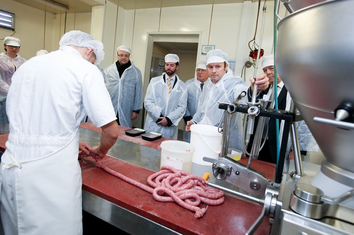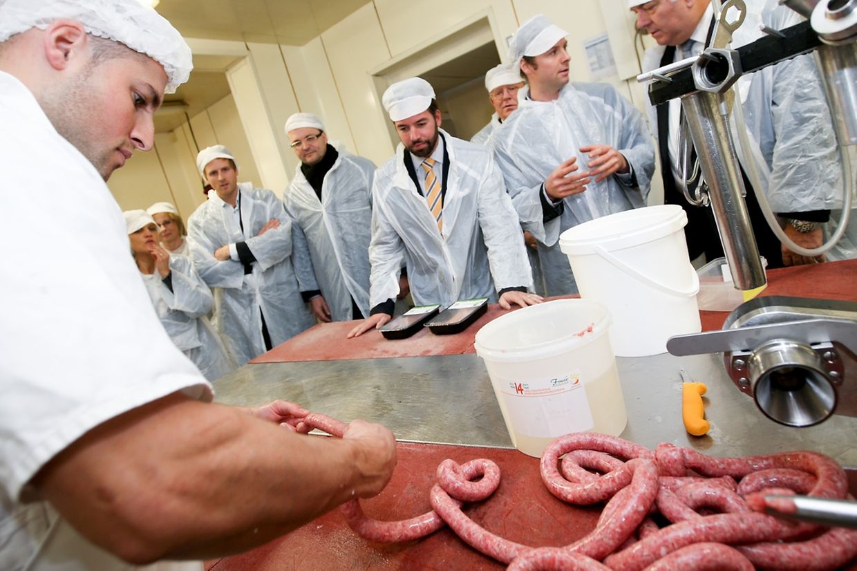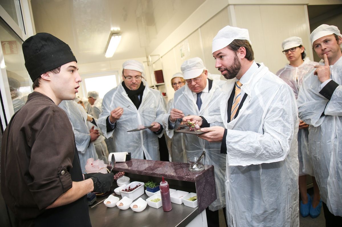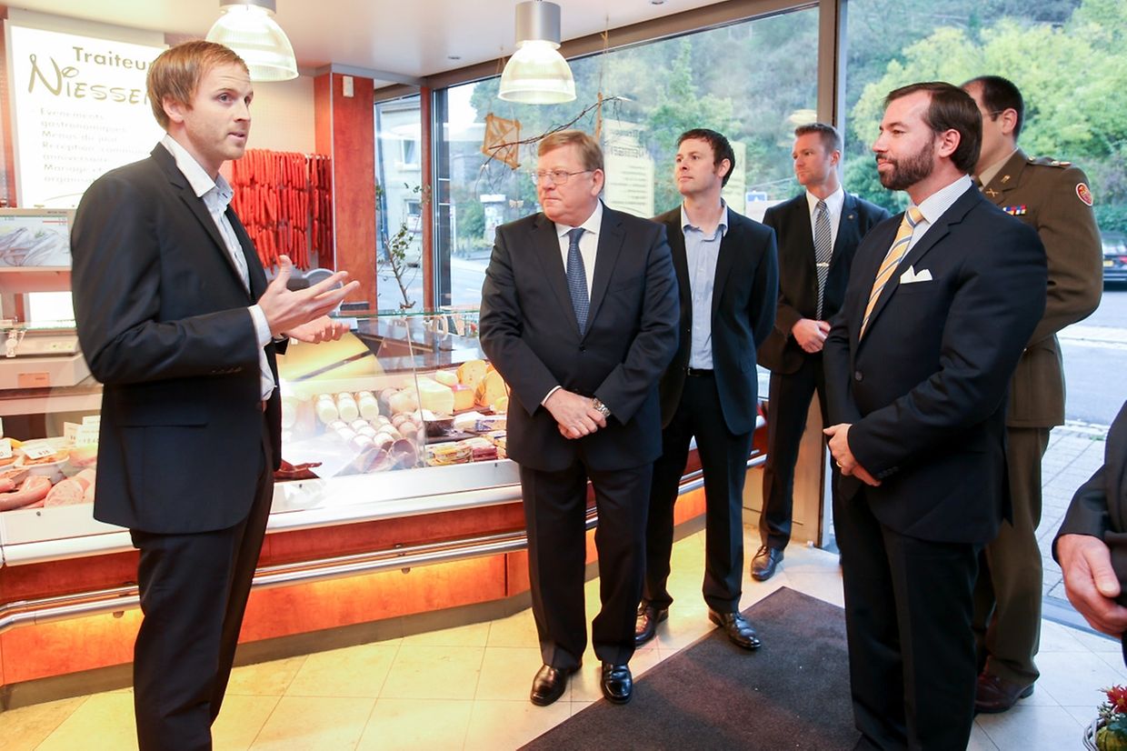 Der Erbgroßherzog wurde in Ulflingen von den beiden Inhabern des Familienbetriebs, Jean-Marie und Patrick Niessen, begrüßt und durch die modernen Anlagen geführt. In der Metzgerei erhielt er Erklärungen, wie die größtenteils aus der Region stammenden Schweine, Rinder und Lämmer zerlegt und das Fleisch für den Verkauf vorbereitet werden. In der Küche wurde ihm die Zubereitung der Tagesmenüs, Fertiggerichte und sonstigen Delikatessen gezeigt, bevor man zu einer Verköstigung überging.