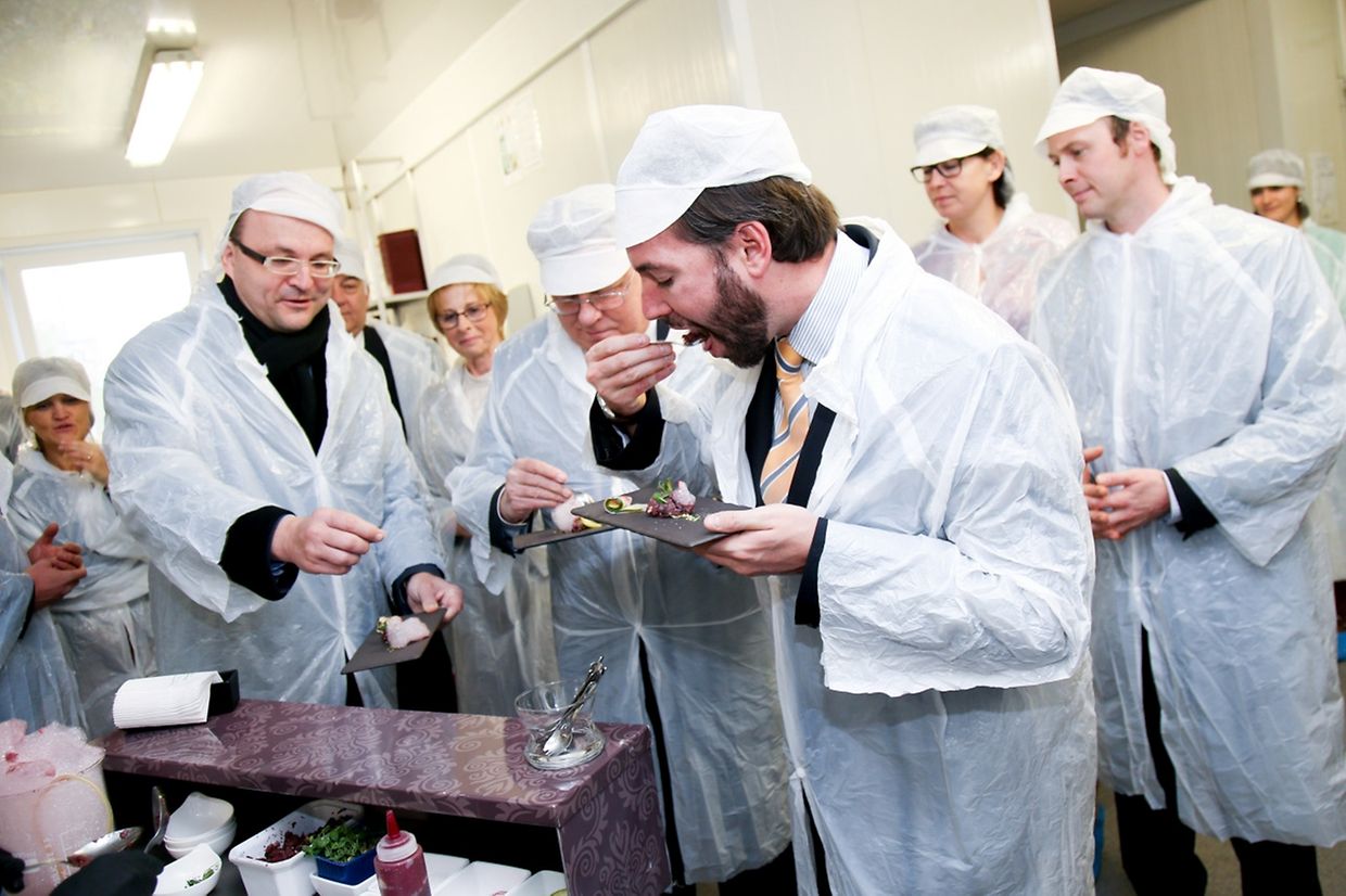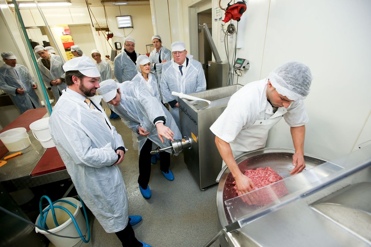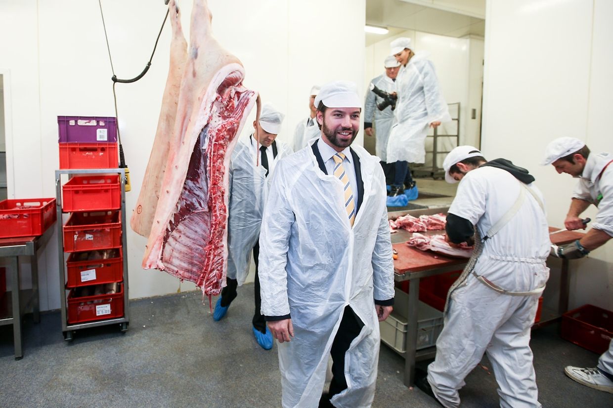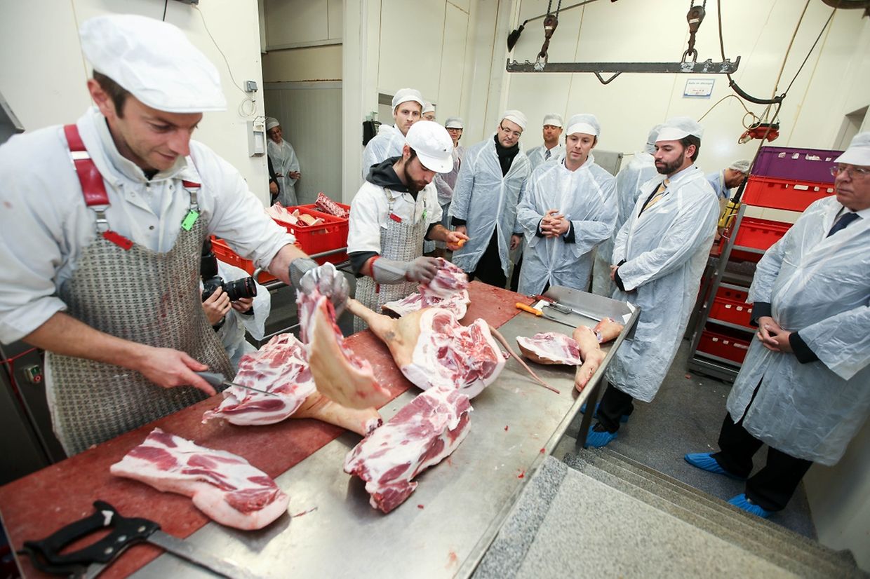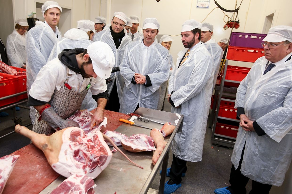Der Erbgroßherzog wurde in Ulflingen von den beiden Inhabern des Familienbetriebs, Jean-Marie und Patrick Niessen, begrüßt und durch die modernen Anlagen geführt. In der Metzgerei erhielt er Erklärungen, wie die größtenteils aus der Region stammenden Schweine, Rinder und Lämmer zerlegt und das Fleisch für den Verkauf vorbereitet werden. In der Küche wurde ihm die Zubereitung der Tagesmenüs, Fertiggerichte und sonstigen Delikatessen gezeigt, bevor man zu einer Verköstigung überging.
