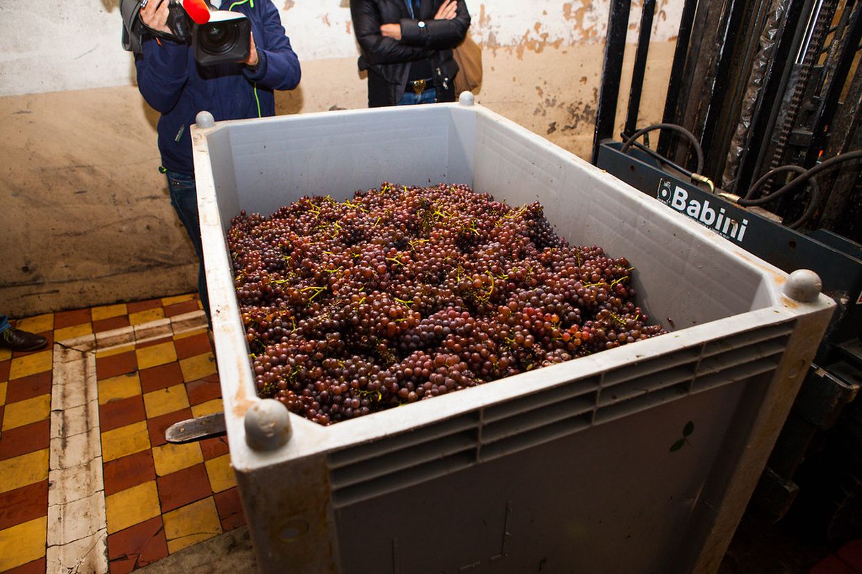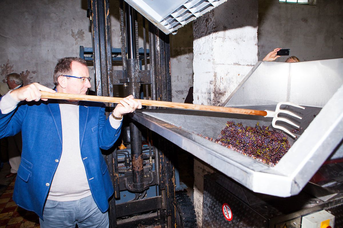 Im Beisein von Henri Streng, Präsident des „Fonds de solidarité viticole“ und der „Commission de promotion des Vins et Crémants Luxembourg“, Marc Gales, Präsident der "Fédération luxembourgeoise des vins et spiritueux", und anderen Vertretern der Branche erhielt Weinbauminister Fernand Etgen einen Einblick in die Arbeit eines Erntehelfers und schaute der Traubenablieferung in der Privatkellerei Krier-Bisenius in Bech-Kleinmacher zu.