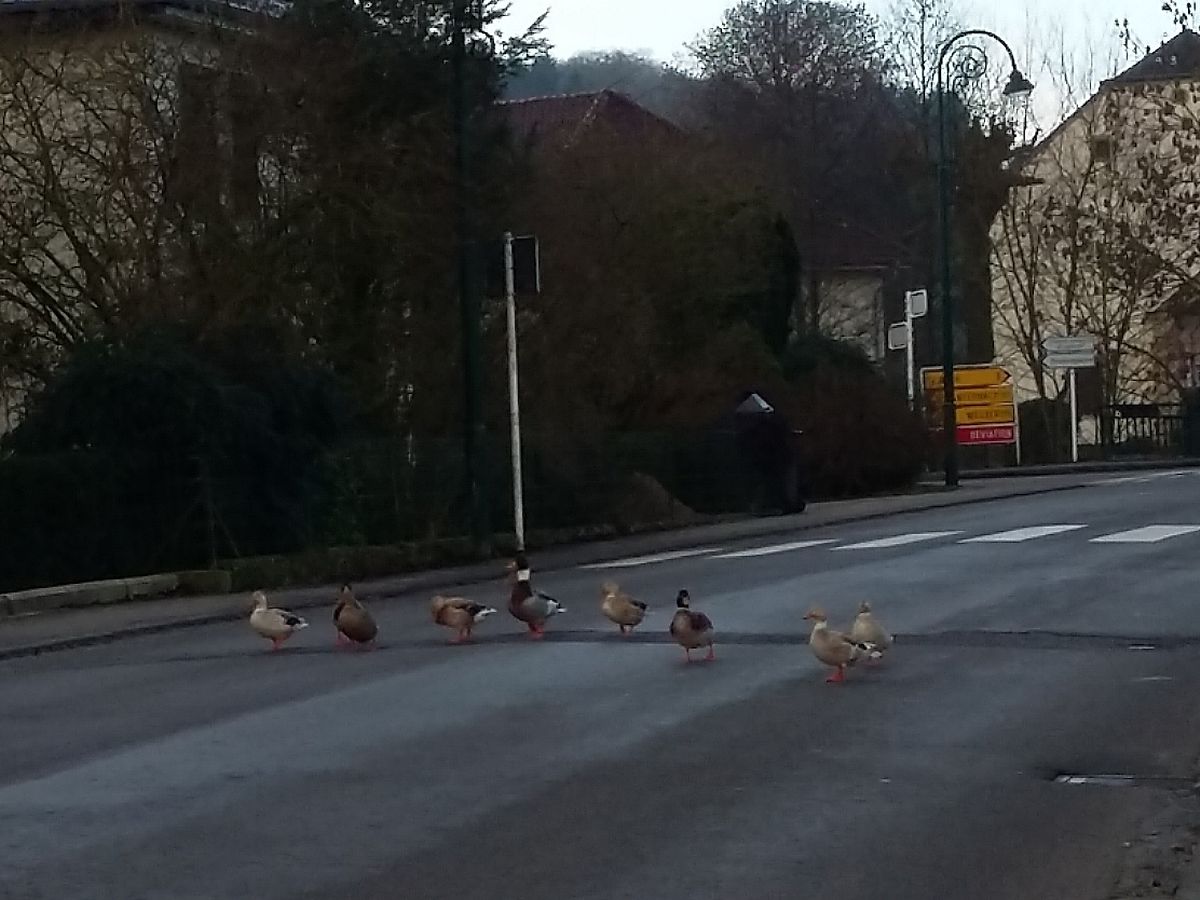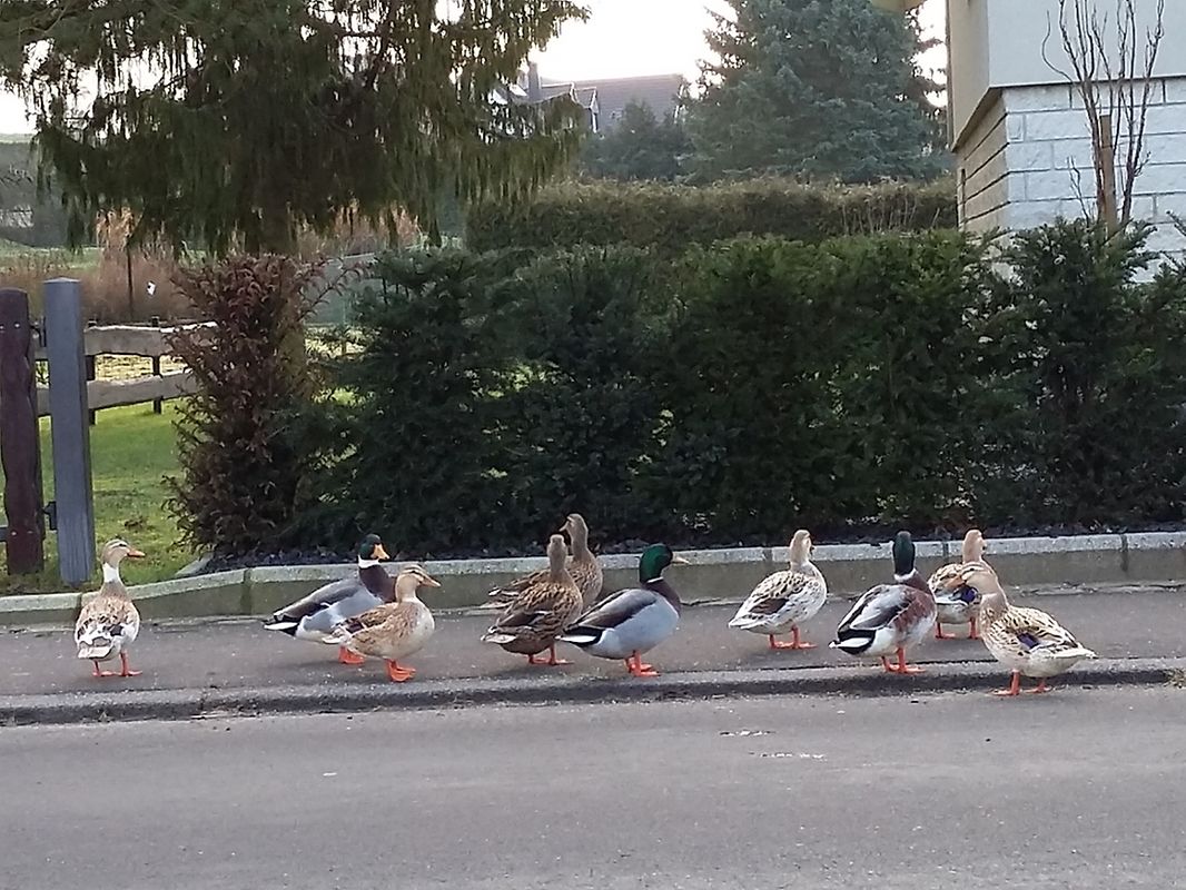 Seit Monaten erfreut eine grosse Entenfamilie die Einwohner, Durchfahrende aber vor allem auch die Kinder des Dorfes. Die Familie hält sich am Sauerbach auf, wo sie täglich zum Kindergarten spazieren, und dies immer über die Durchfahrtsstrasse, wo sie regelmässig für ein Schmunzeln auf den Gesichtern der Autofahrer und aller Familien sorgen. Heute morgen nun, machen sie einen längeren Dorfspaziergang über den Hierberwee, einfach köstlich, schade nur, dass sie den Fussgängerstreifen verpasst haben... dennoch benutzen sie das Trottoir.