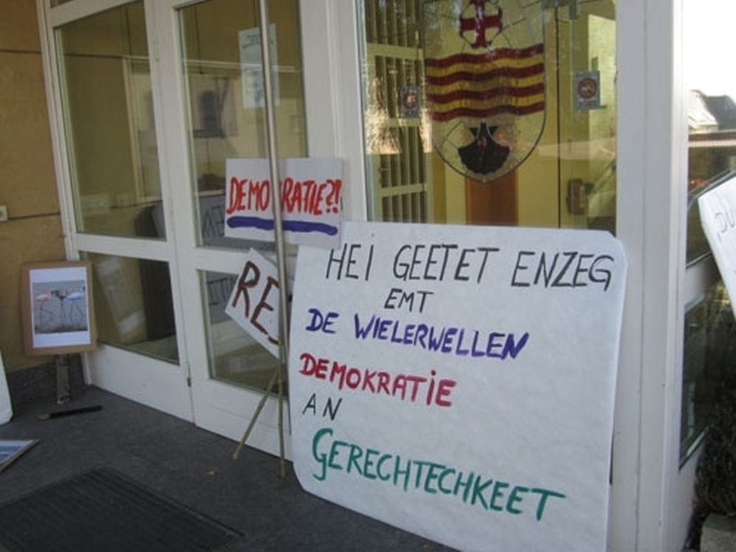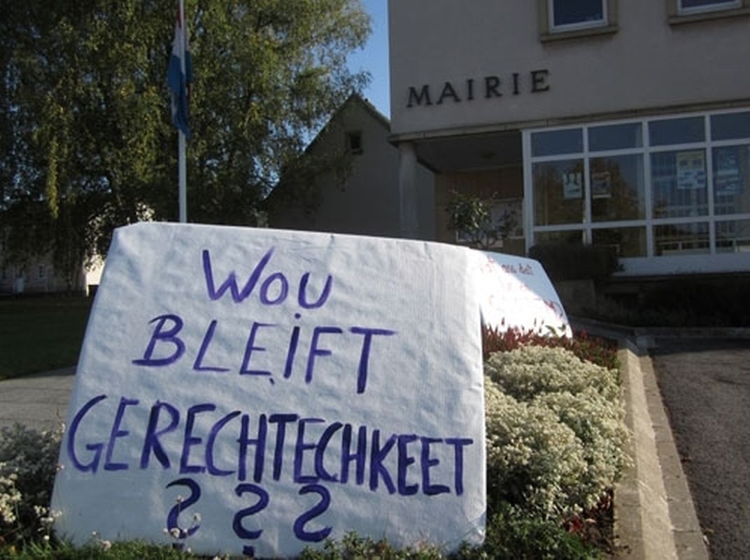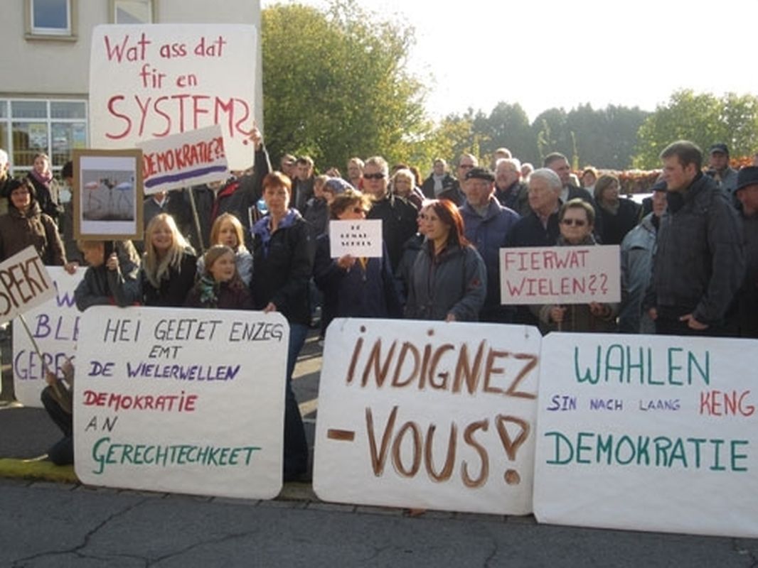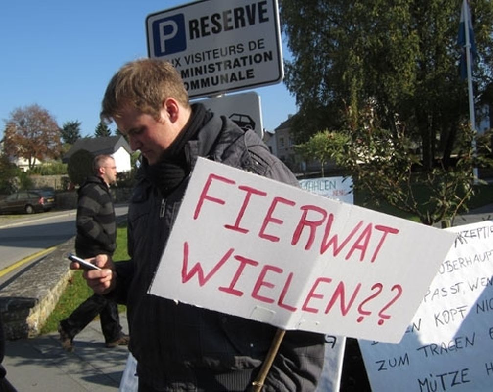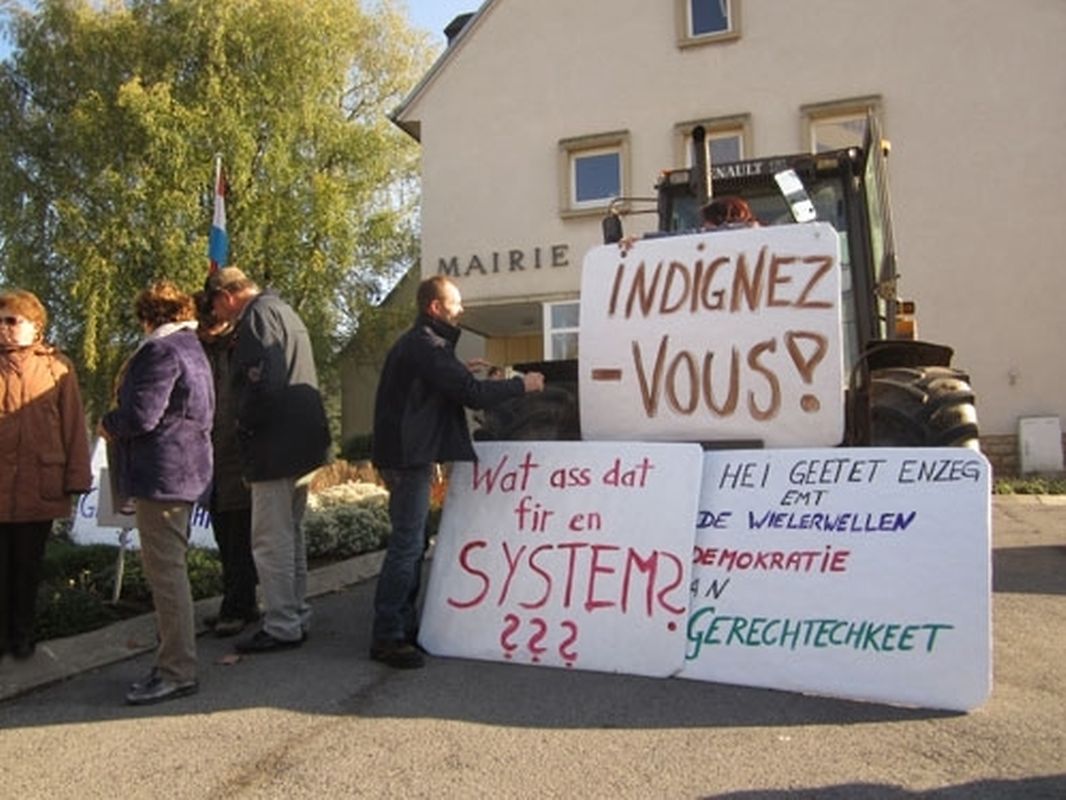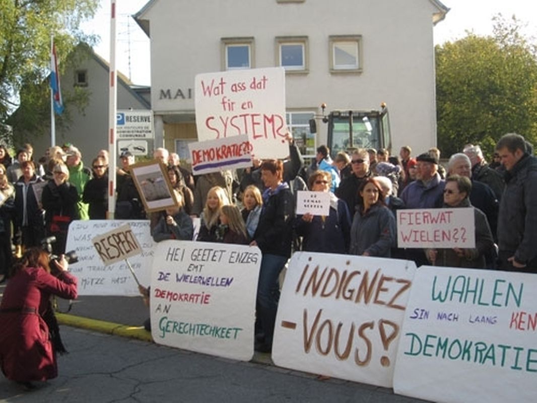Etwa 200 Conterner Bürger hatten sich am Samstagnachmittag vor dem Rathaus versammelt, um gegen die neue Koalition im Gemeinderat zu demonstrieren. Mit dabei waren Einwohner aller Altersschichten, sowie Politiker und Ehrenbürgermeister der Gemeinde. Ein Traktor war auf dem Parkplatz in Stellung gegangen. Davor positionierten sich die Kundgebungsteilnehmer mit selbst gemalten Tafeln. "Firwat wielen?", "Indignez-vous", "Wou bleift Gerechtegkeet?", "Kee Gemauschels", "Hei geet et eenzeg em de Wielerwellen", stand auf den Plakaten zu lesen.