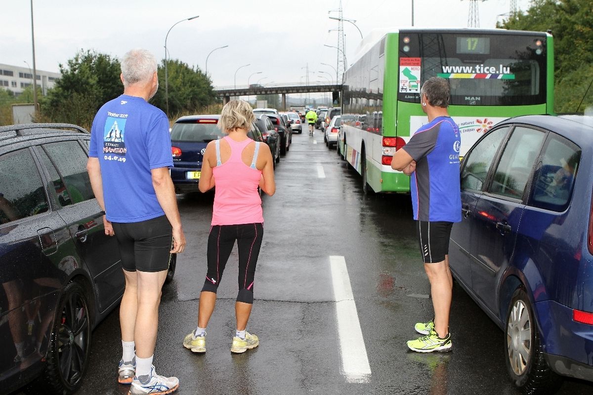 Etliche Läufer steckten rund um den Raemerecher Kreisverkehr in ihren Fahrzeugen fest und wussten ihrer Hände keinen Rat. Zwar konnte man von weitem schon das Esch-Belvaler Areal erkennen, aber der Autotross bewegte sich keinen Deut weiter…und die Zeit verstrich! So nah und doch so fern erschien das Ziel…