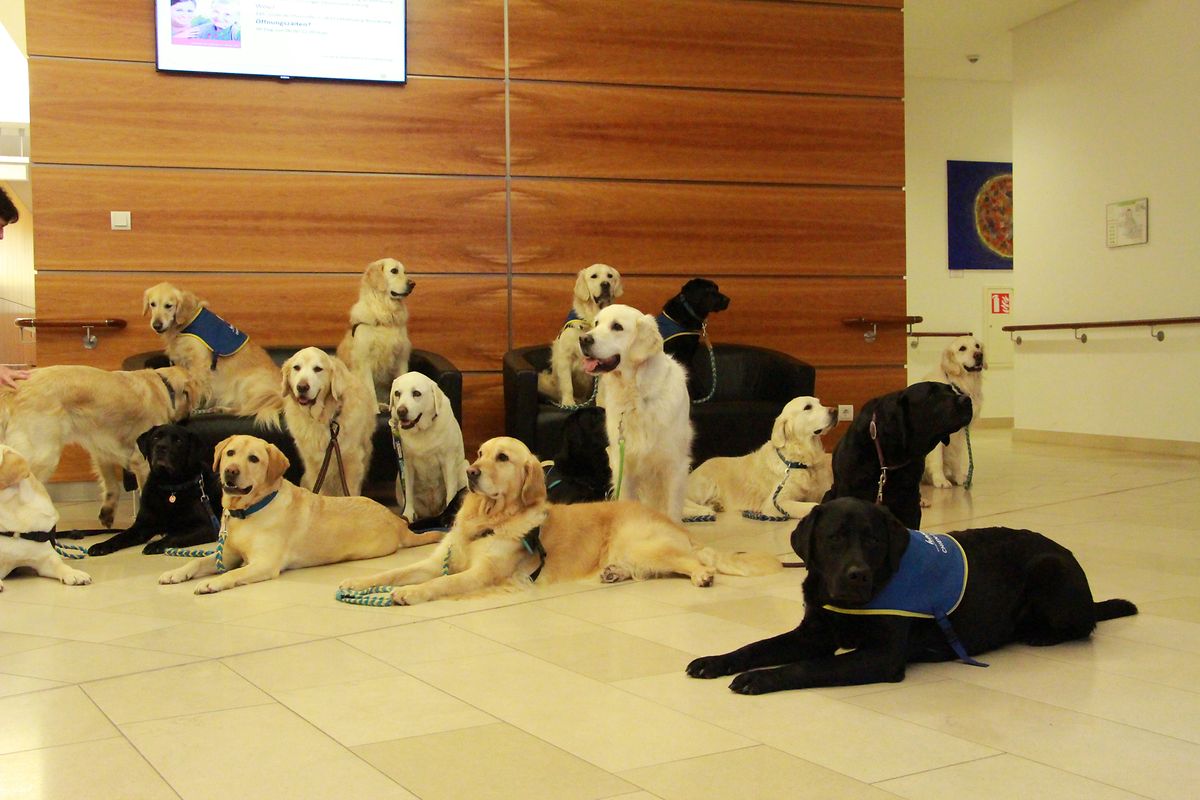 Drei dieser Hunde arbeiten ehrenamtlich in Pflegeheimen, Tagesstätten, Schulen und machen regelmässig Hausbesuche bei schwerstbehinderten Kindern.