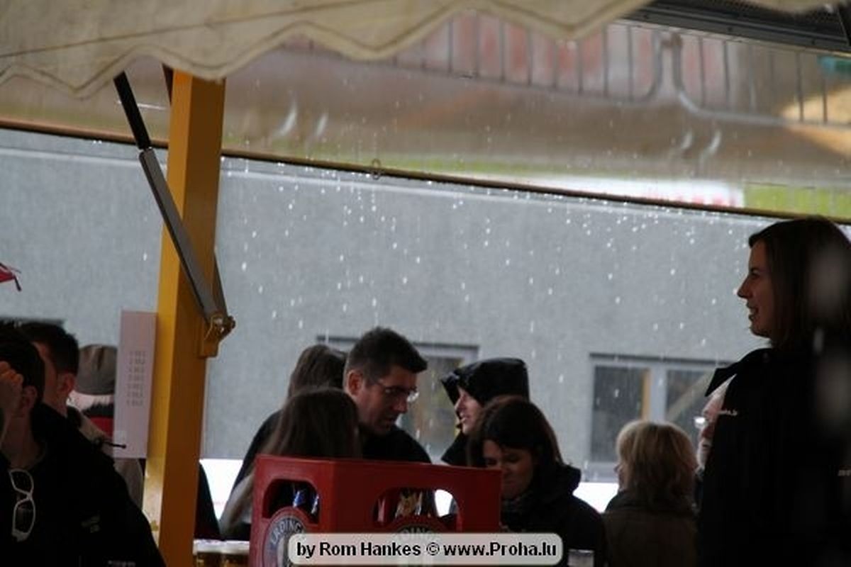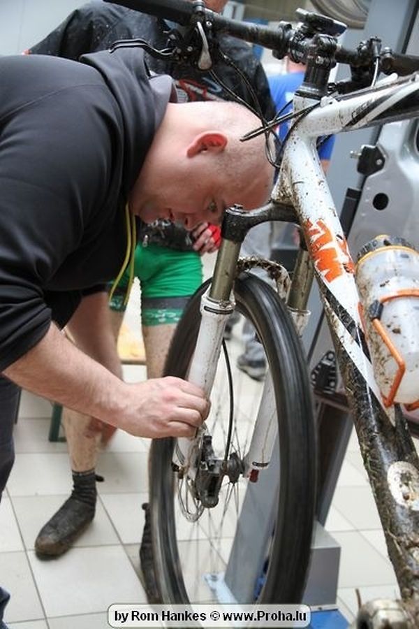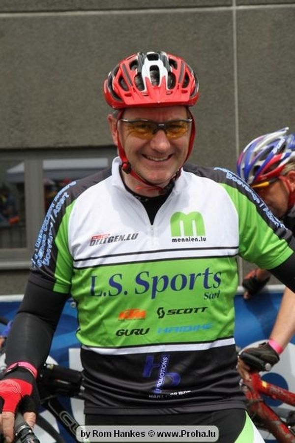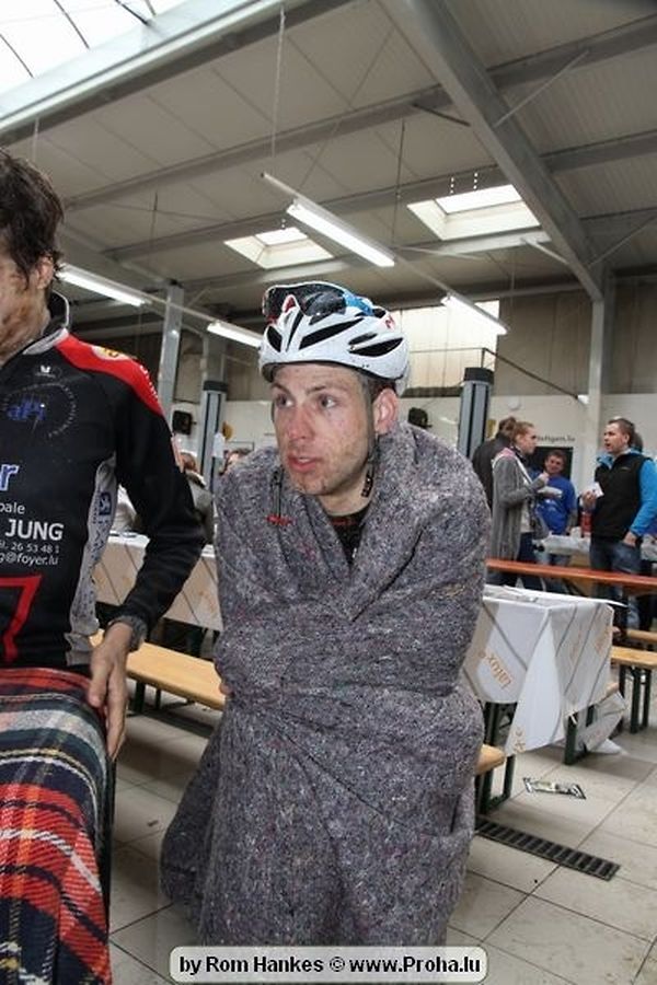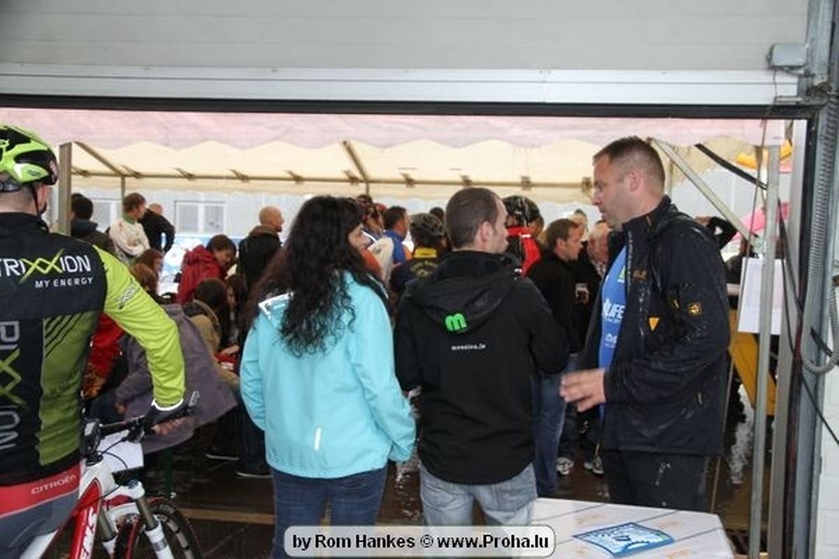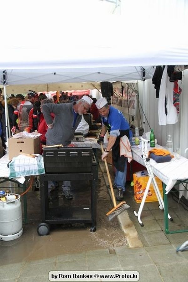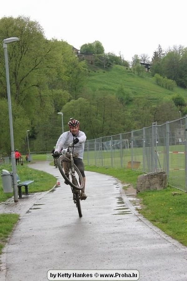 Um 14 Auer pünktlech sollten dun awer och déi Erwuessen un den Départ goen, an och hinnen sollt d´Laun duerch d´Wieder net verduerwen gin,heinsdo huet een mol héieren: Et as awer komesch emmer wann ech soll fueren dann reent et grad riicht ran. Me och dat huet sie net zereck gehaalen, hier Kleeder an hier Velo ´en hun bessien gelidden am Bulli an deen een oder anner sollt och mol vum Suedel rutschen an sech 1 Ronn ganz duerch de Bulli wenzelen, me et as kengem eppes geschitt an daat ganzt gouf mat vill Humor opgehol,gelaacht, ugefeiert an zereck op de Velo gesprong well virun sollt et goen.