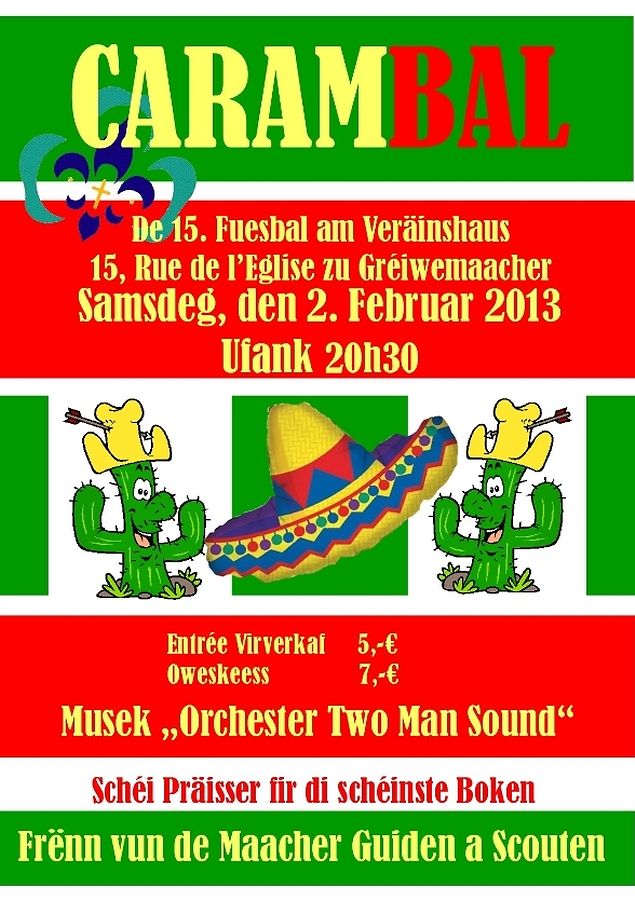 Grevenmacher Carambal am Veräinshaus zu Maacher Jean-Paul Schiffmann 7 Bildergalerie Bitte scrollen Sie nach unten,um weitere Bilder zu sehen. Veröffentlicht am Montag, 11. Februar 2013 um 13:16 "E puer Boken vun eisem Bal an d´Gewënner vun de Corbeillen fir déi schéinste Boken. Den eischte Präis gung vun déi leif aal Koppel Gaby an Maria." Gewinner Carambal 2 Feb 2013.pdf affiche Carambal.pdf Unpassenden Inhalt angeben Weitere Neuigkeiten von Jean-Paul Schiffmann > (Fotoen) Theatersteck "En Thai fir den Här Buchholz" 11.04.13 Grevenmacher D'Buerg-Lagerfeier huet zu Maacher beim Pompjeesbau gebrannt 25.02.13 Grevenmacher Buergbrenne vun de Guiden a Scouten mat hirer Amicale zu Gréiwemaacher 26.02.12 Grevenmacher