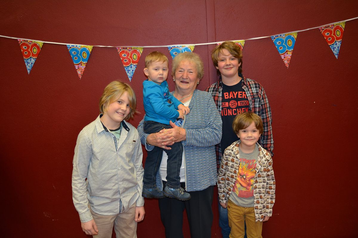 D'Madamm Regine Winckel-Biewer vun Hiefenech huet dëse Weekend hiren 80ten Gebuertsdag am Krees vu Famill a Frënn gefeiert. D'Regine ass den 27 Januar 1938 zu Igel bei Tréier gebuer ginn, wou se och hir Jugend verbruecht huet. Ob Sylester 1954 huet d'Regine am Hotel Kohl als Zëmmermeedchen ugefaangen ze schaffen. Hei huet Si de Pierre Winckel kennegeléiert deen Si den 9 November 1956 bestuet huet. Aus dem Bestietnes ass 1 Meedchen, 2 Enkelinne a 4 Ur-Enkel erausgaangen. Op der Foto gesäit een d'Regine am Krees vun hiren Ur-Enkel. Vun dëser Platz aus all Guddes gewënscht a nach vill schéi Joeren derbäi.