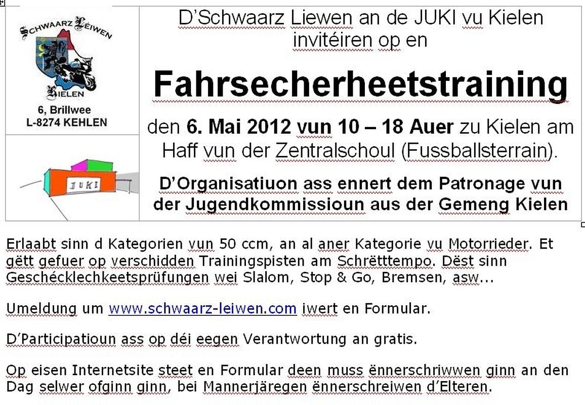 D’Schwaarz Liewen an de JUKI vu Kielen invitéiren op en Fahrsecherheetstraining den 6. Mai 2012 vun 10 – 18 Auer zu Kielen am Haff vun der Zentralschoul (Fussballsterrain).