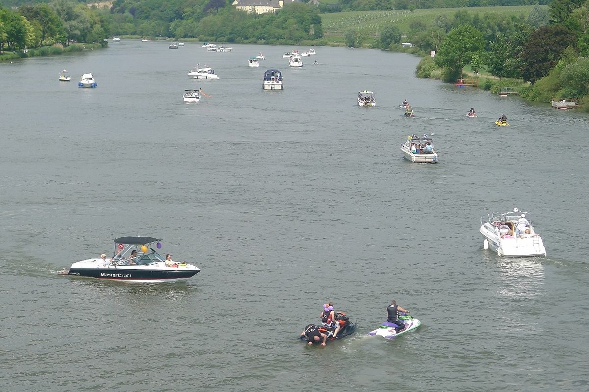 Gegen 15 Uhr verließen die festlich geschmückten Boote den Hafen um sich unterhalb der Brücke in Remich zu formieren. Angeführt vom Präsidenten des MYCL Josy Popov im Club eigenen Boot, begab sich der Umzug flussaufwärts zurück zum Anlegesteg in Remich, um von Pfarrer Daniel Graul den Segen zu empfangen. Am Umzug nahmen etwa 50 Boote und Jet-Skifahrer teil. Zahlreiche Zuschauer hatten sich in Remich eingefunden um dieser Fluss-Parade zuzusehen.