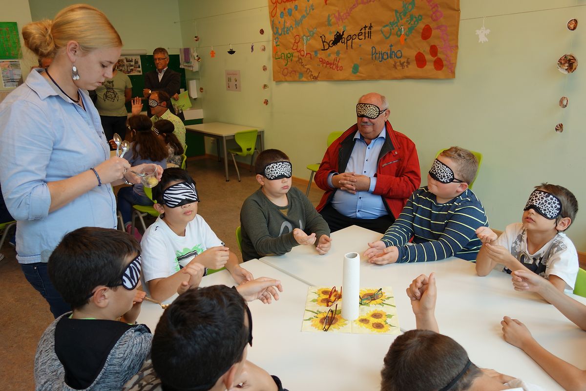 Im Rahmen einer Pressevorstellung konnten die Kinder zusammen mit der Umweltministerin Carole Dieschbourg und anderen prominenten Persönlichkeiten "Essen mit allen Sinnen erleben". So gab es etwa ein Geschmacksatelier, bei dem die Teilnehmer mit verbunden Augen Lebensmittel und Gewürze erkennen mussten. Mit von der Partie waren auch Pollo Bodem (Bürgermeister Useldingen), Gérard Anzia (Präsident SICONA-Centre), Camille Pletschette (Delegierter von SICONA) sowie Vertreter der Catering-Firma Dussmann.