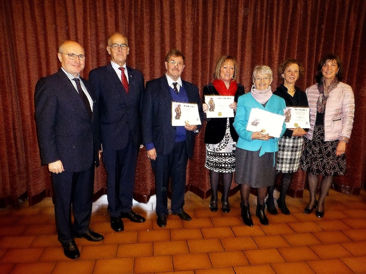 Sonndes mëttes gouf et am Porheem e Mëttegiessen fir d’Memberen a Frënn vum Veräin. Beim Aperitif huet de President Pierre Kummer eng kleng Usprooch gehal a Cadeauen iwwerreecht fir besonnesch geleeschten Aarbecht: der Dirigentin, dem Organist Jemp Kinn an dem Archivar Michel Langue. (De Roger Goodwyn konnt aus Gesondhetsgrën dunn net dobäi sinn.) Véier Sänger goufe fir hir laangjäreg Aktivitéit geéiert: d’Dammen Getty Glaesener-Wolter, Maggy Dostert-Thill a Marie-Paule Schmitz-Lampertz kruten d’gëlle Medail fir 30 Joer an den Här Claude Thill d’bronze Medail fir 10 Joer Memberschaft am Piusverband.