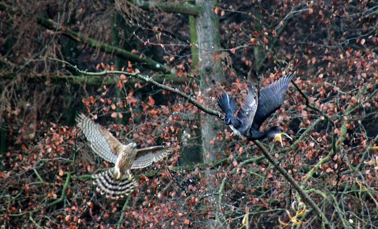 Well ech wousst dat sech an de Bëscher ronderëm Tuermfalken ophalen, an déi Kormoran attackéieren hunn ech mech am Gebësch kleng gemat , an hunn duerch Chance esou een Kampf konnten fotograféieren.Leider hat ech net mäin professionelles Objektiv bei mer, da wären Fotoen super schaarf ginn.Et war e flott Erliefnis, dat awer no 5 Sekonnen eriwwer war.