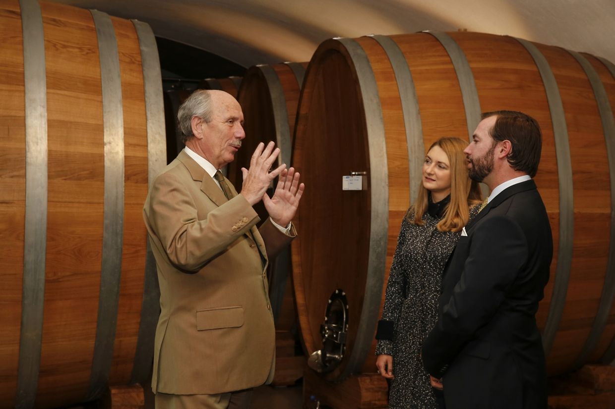 Eine Kellerei mit einer langen Geschichte bekamen Erbgroßherzog Guillaume und Erbgroßherzogin Stéphanie zu sehen. Die Besichtigung der Fässer und des Flaschenlagers war inklusive.