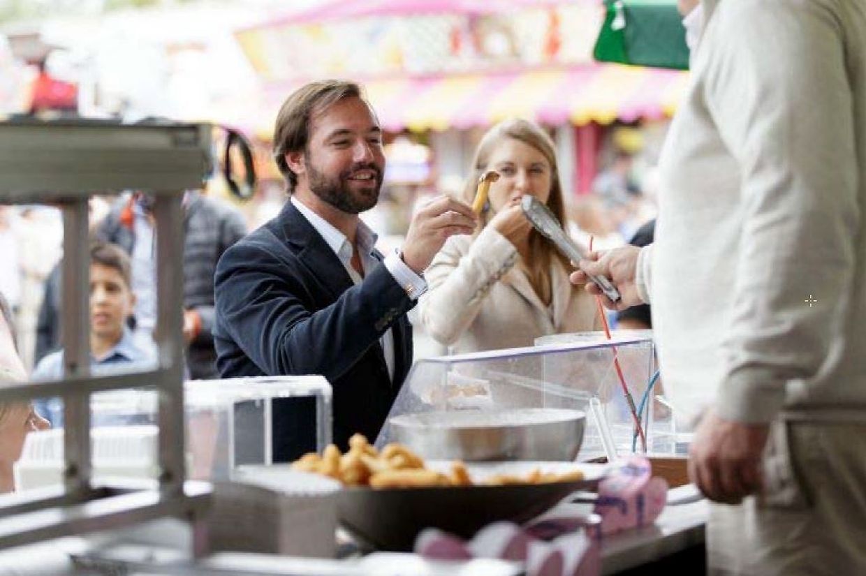 Erbgroßherzog Guillaume und Erbgroßherzogin Stéphanie kaufen Süßes zum Mitnehmen.