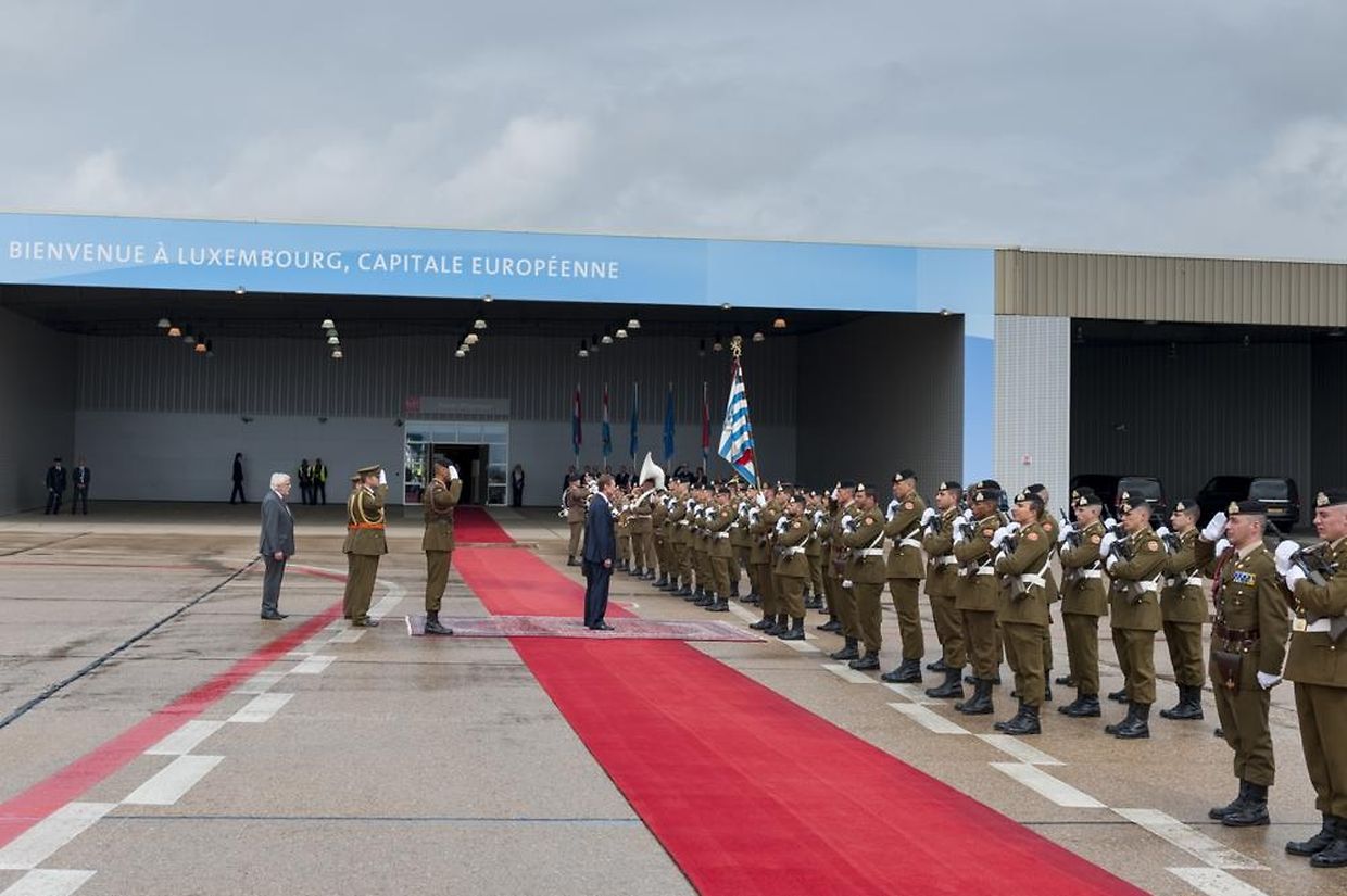 Eine Ehrenfront der Armee verabschiedete das Staatsoberhaupt auf dem Flughafen Findel bei bedecktem Himmel.
