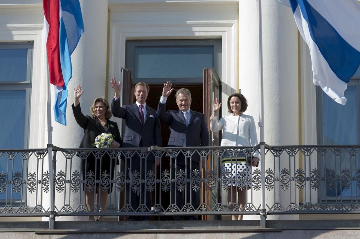 Großherzog Henri und Großherzogin Maria Teresa zusammen mit dem finnischen Präsidenten Sauli Niinistö und seiner Frau Jenni Haukio auf dem Balkon des Präsidentenpalasts.