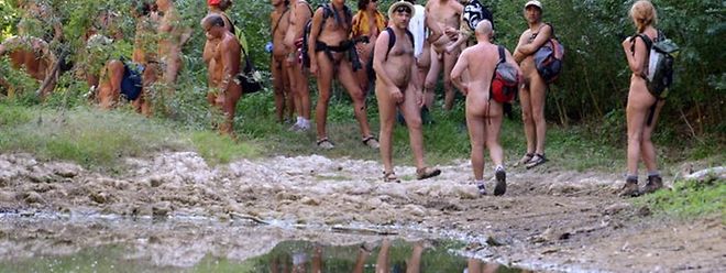 Hommes et femmes de diverses corpulences, âgés de 35 à 60 ans, ils sont dans le plus simple appareil, à l'exception de l'équipement de base du randonneur: grosses chaussures de marche, parfois sandales avec chaussettes, sacs à dos et bâton de marche pour certains.