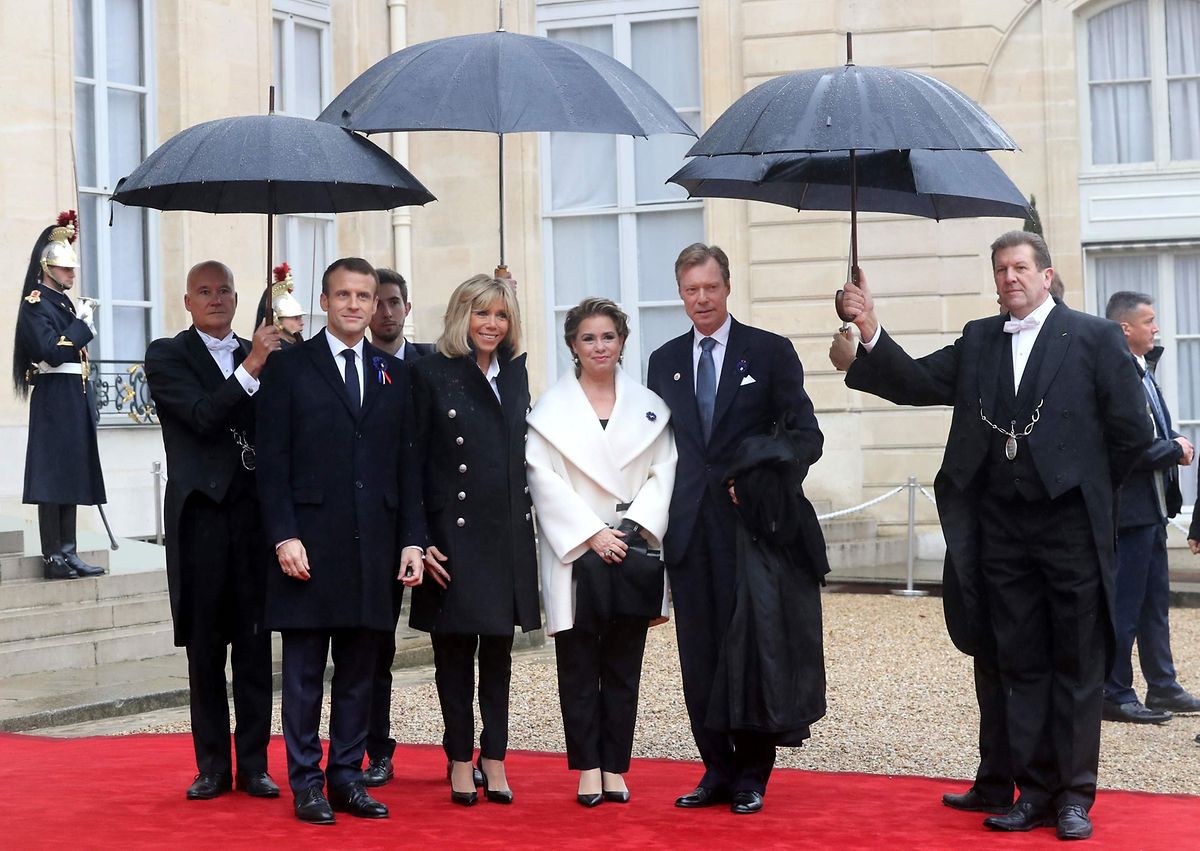 French President Emmanuel Macron (L) and his wife Brigitte (2L) welcome Henri, Grand Duke of Luxembourg and Maria Teresa, Grand Duchess of Luxembourg at the Elysee Palace in Paris on November 11, 2018 ahead of the start of commemorations marking the 100th anniversary of the 11 November 1918 armistice, ending World War I. (Photo by Jacques Demarthon / AFP) AFP