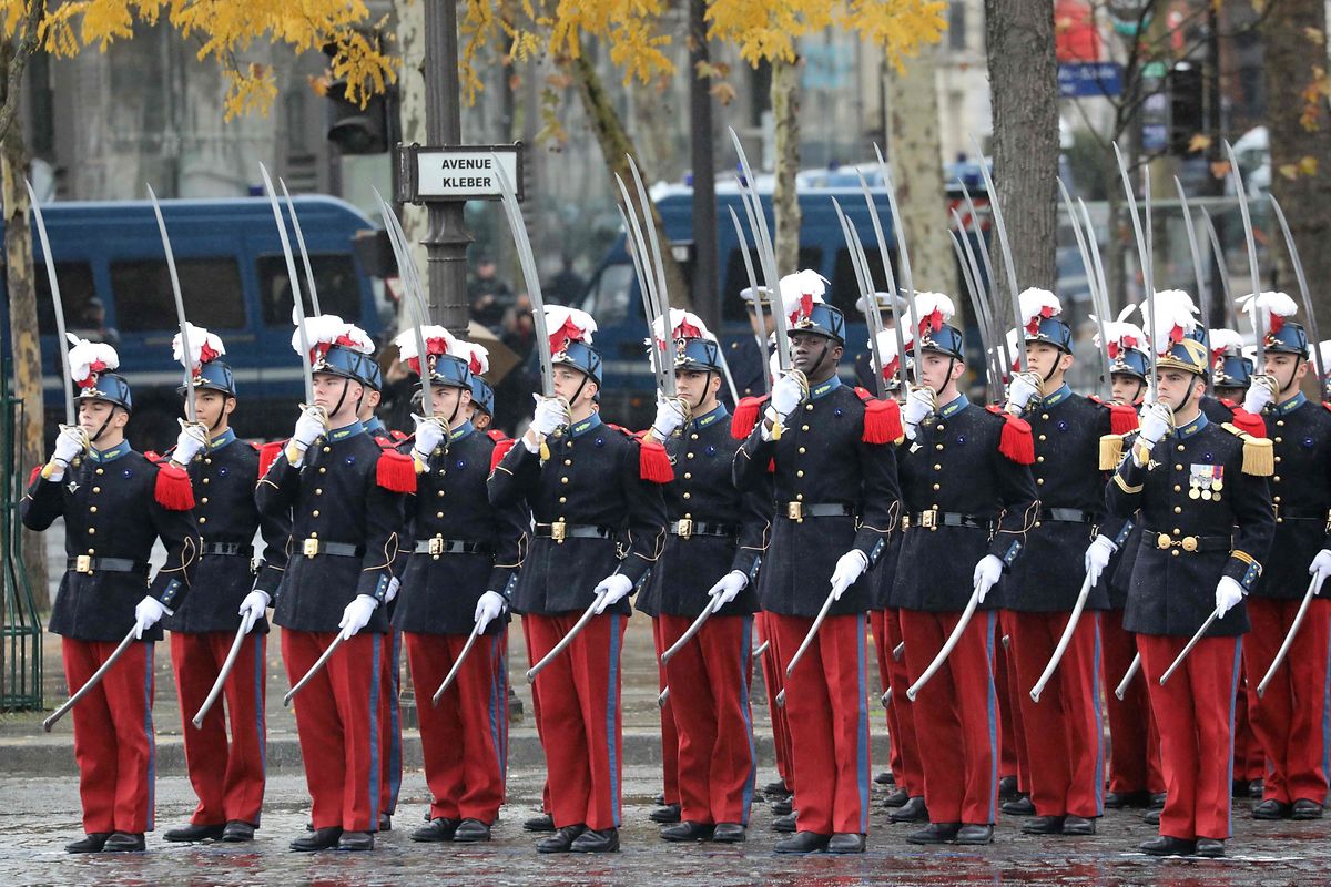 Republican guards take part in a ceremony at the Arc de Triomphe in Paris on November 11, 2018 as part of commemorations marking the 100th anniversary of the 11 November 1918 armistice, ending World War I. (Photo by ludovic MARIN / AFP) AFP