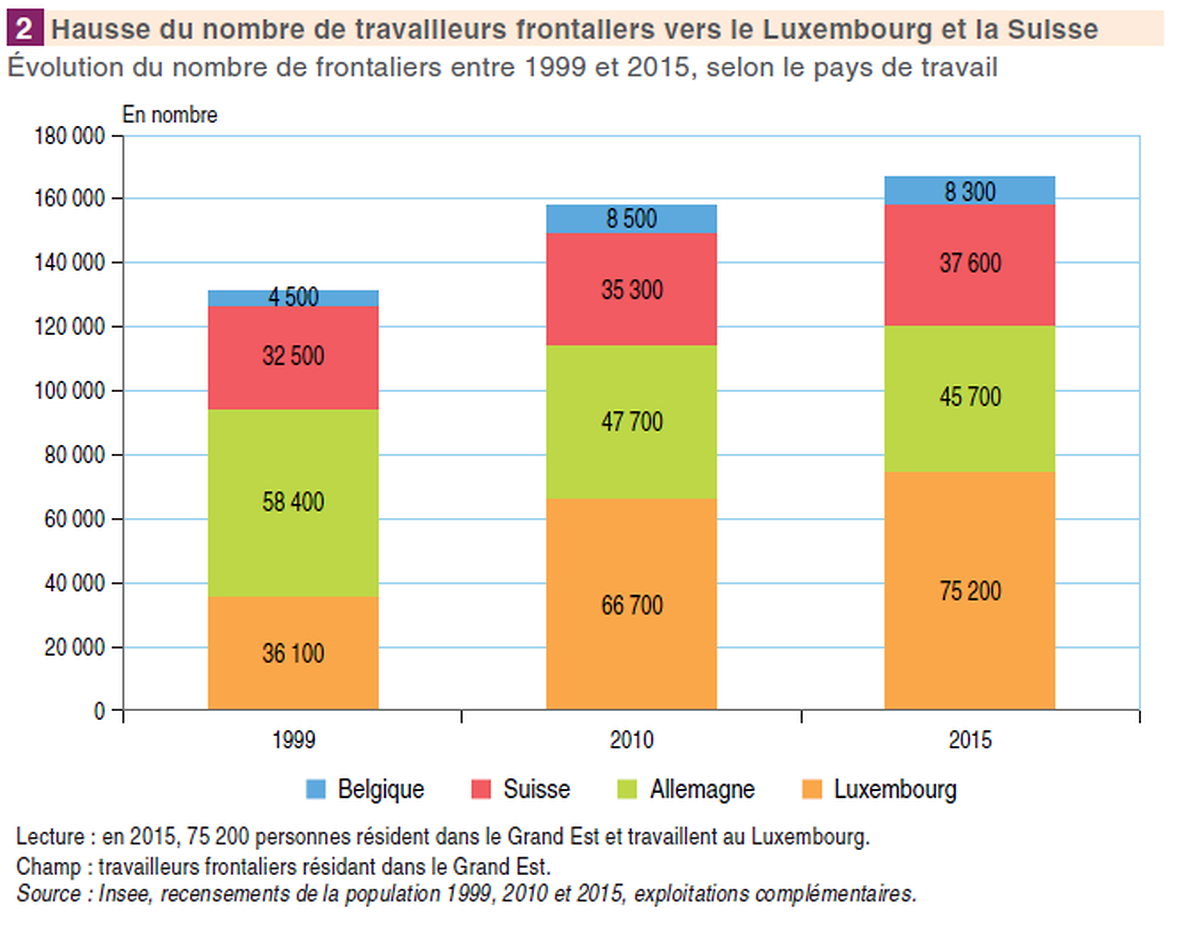 Le Luxembourg est la première destination des frontaliers du Grand Est. Selon les chiffres de l’Insee publiés ce mardi, 75.000 actifs – sur les 167.000 frontaliers résidant dans la région – travaillaient au Luxembourg en 2015. Ils étaient 36.000 en 1999. L’Allemagne reste le deuxième lieu de travail des frontaliers grandestois (46.000 actifs), même si leur nombre a diminué de 1,5% par an. La Suisse (38.000 personnes) et la Belgique (8.000 personnes) ferment le peloton.
