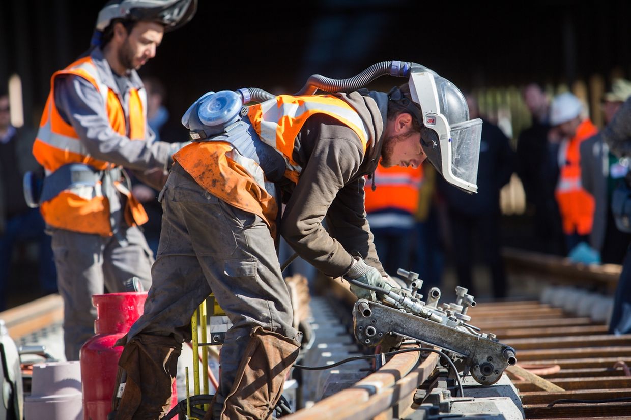 Guidé par un ouvrier, le ministre a d'abord participé à la soudure de deux rails par aluminothermie sur les voies déjà installées devant le centre de remisage: