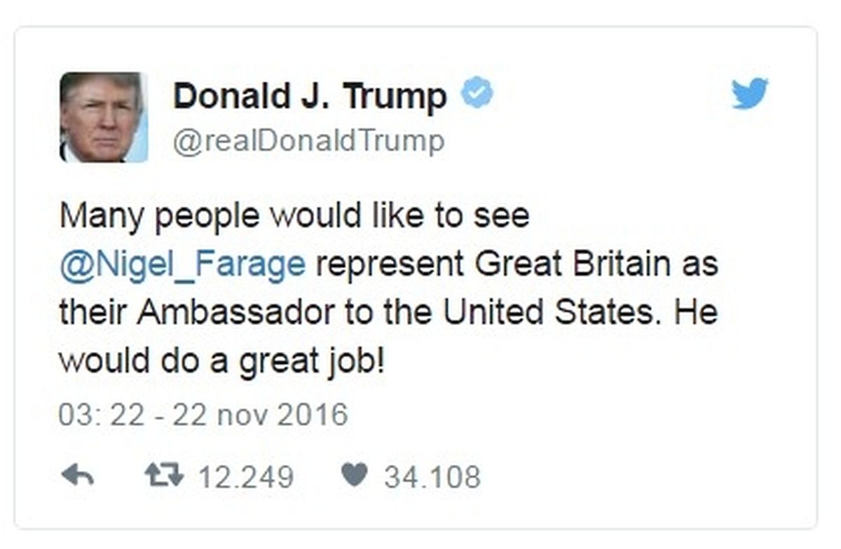 “Muitas pessoas gostariam de ver @Nigel_Farage a representar a Grã-Bretanha como o seu embaixador nos Estados Unidos”, escreveu Trump na sua conta no Twitter, acrescentando: “Ele faria um ótimo trabalho!”.