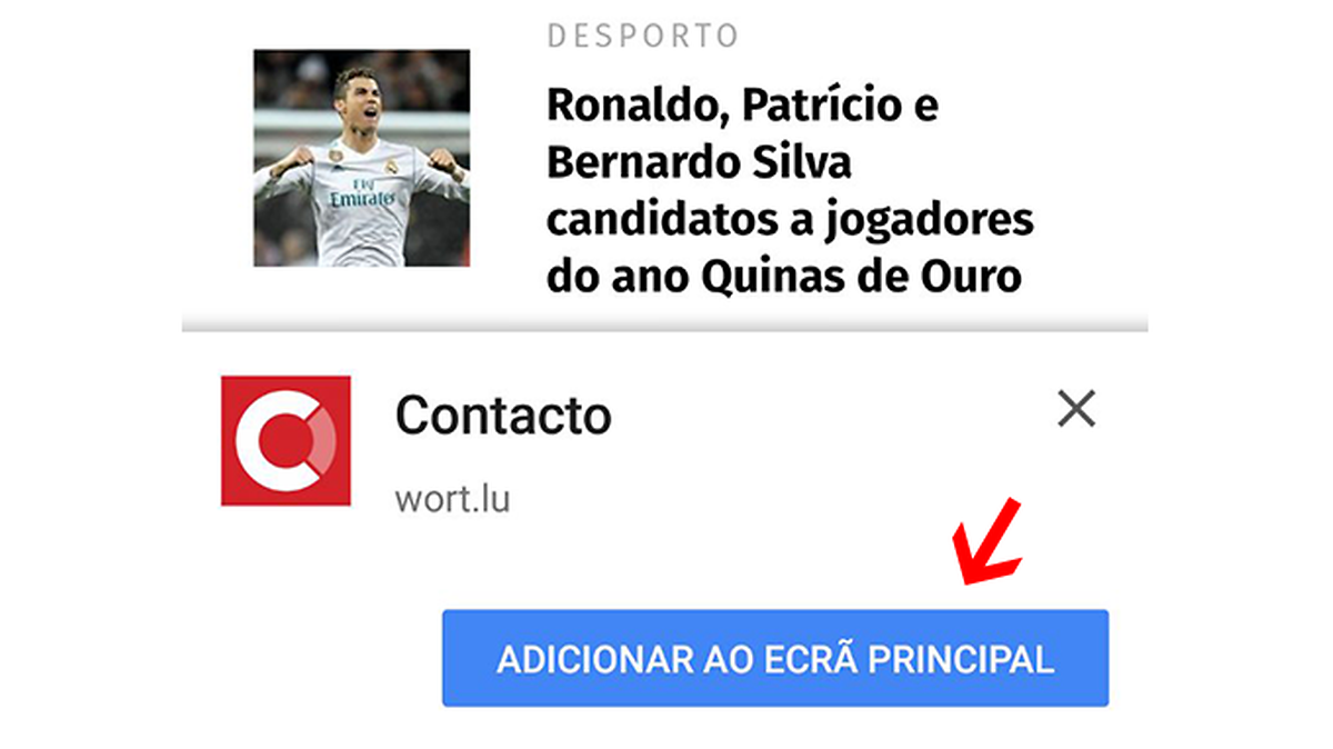 No seu telemóvel Android: Escreva a ligação "app.contacto.lu" no seu browser de pesquisa, entre no site, clique em "Adicionar ao ecrã principal" e faça a instalação direta da aplicação web no seu dispositivo.