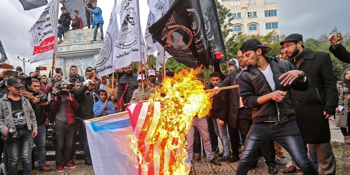 Várias localidades da Cisjordânia foram hoje palco de confrontos entre manifestantes palestinianos e militares israelitas, enquanto na Faixa de Gaza populares queimaram fotografias de Donald Trump e de Benjamin Netanyahu e bandeiras dos Estados Unidos e de Israel.