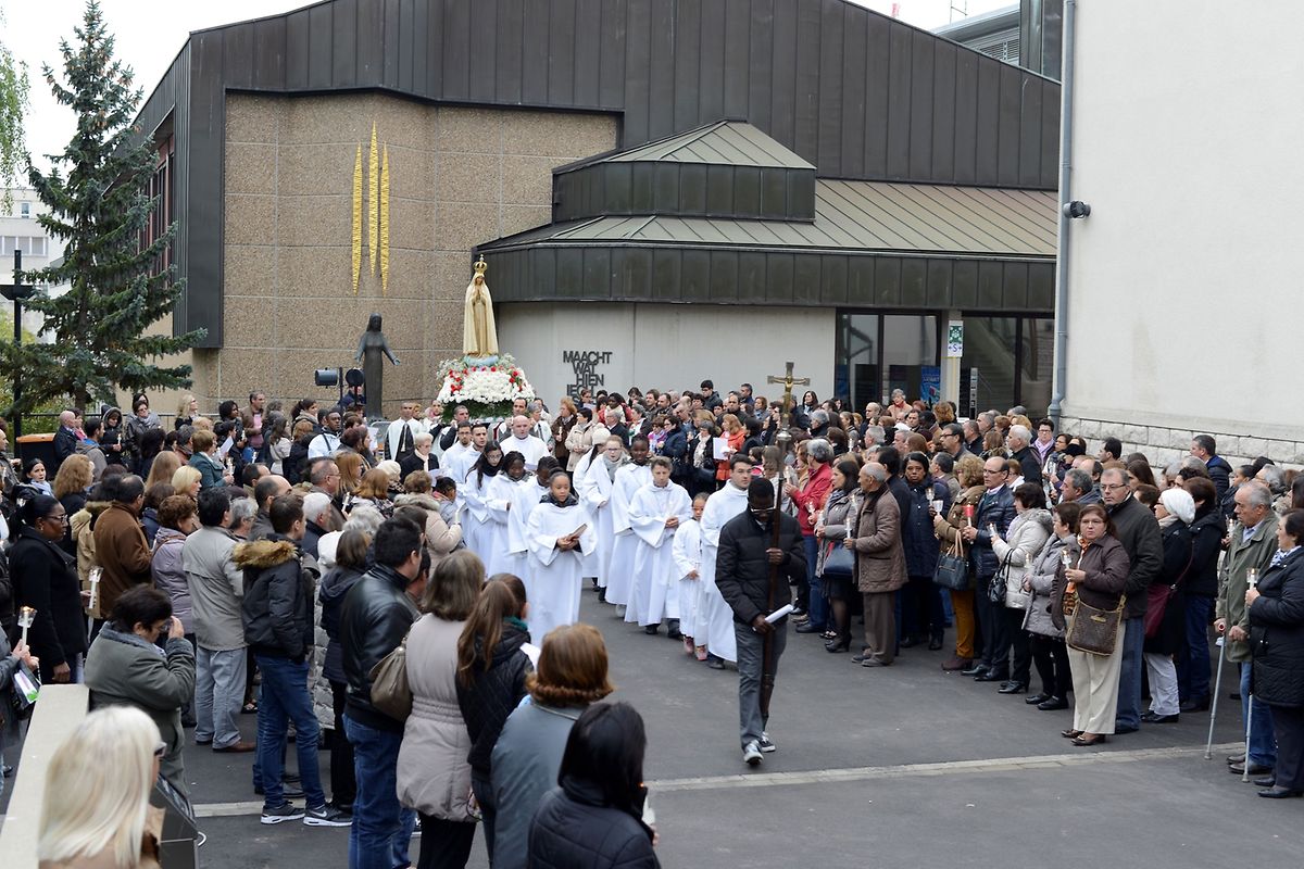 O acolhimento aos fiéis fez-se no recreio da Escola Fieldgen, na rue d’Anvers, de onde o andor saiu com a imagem de Nossa Senhora, passando depois por várias ruas até à igreja do Sacré-Coeur, onde foi celebrada a eucaristia.